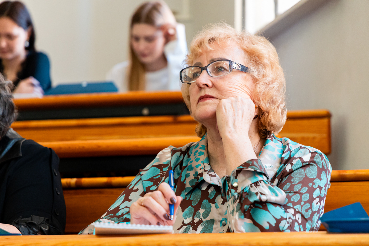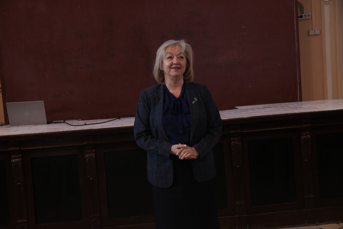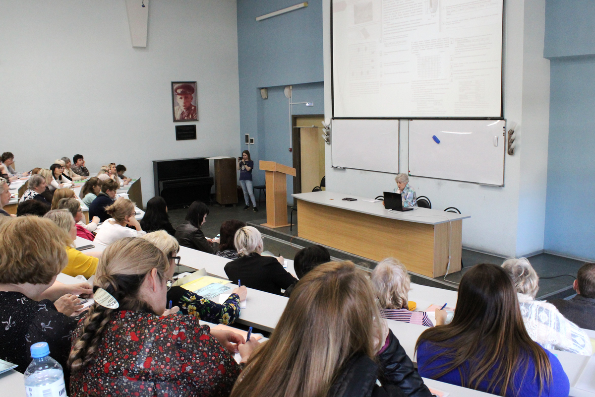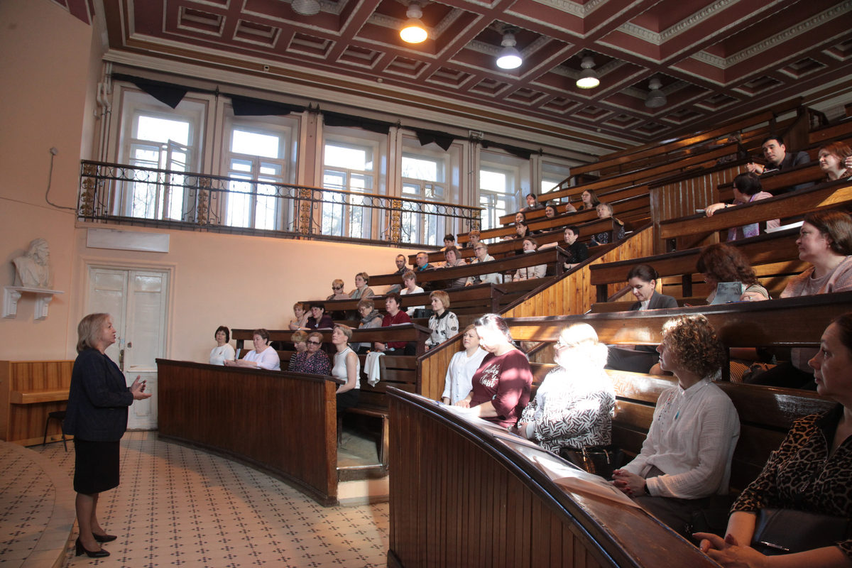 В аудитории собрались многие наши выпускники. Эти обстоятельства накладывают на нас очень большую ответственность. Мне очень приятно видеть здесь и наших магистрантов, которые сегодня учатся и одновременно преподают в школе. И особенно я горжусь тем, что среди вас присутствует моя однокурсница Нина Васильевна Зубкова, которая больше 50 лет работает учителем русского языка и литературы в Гимназии №5