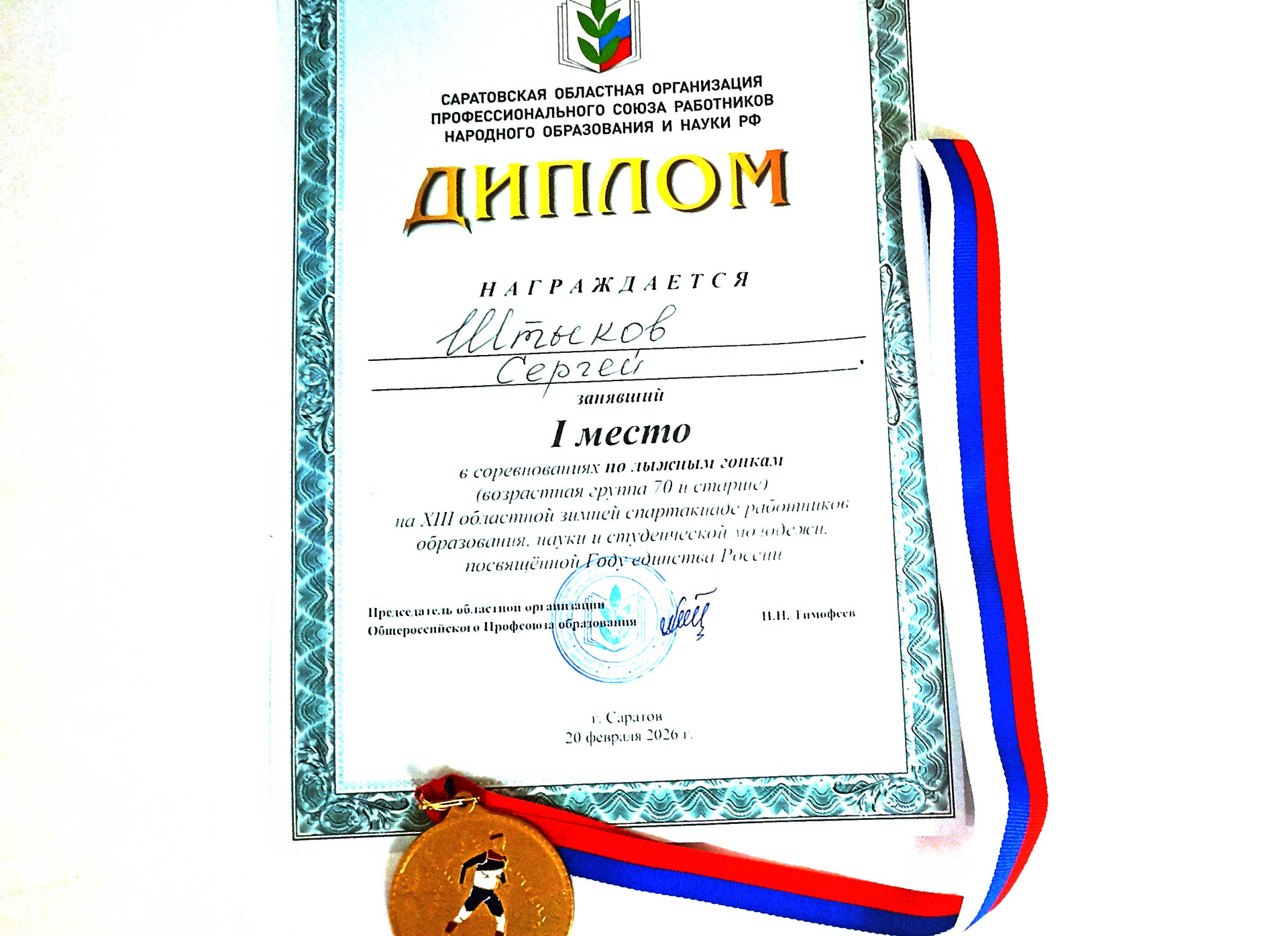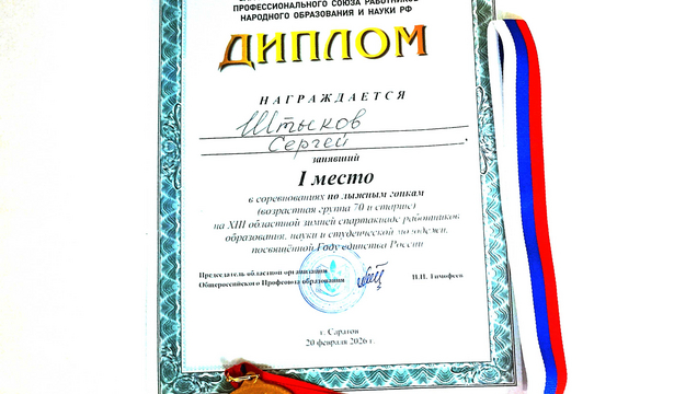 20 февраля на 4 Дачной на стадионе «Зимний» состоялась традиционная 13-я спартакиада профсоюза образования Саратовской области. В ней приняли участие студенты, преподаватели и тренеры школ, спортшкол, колледжей и вузов Саратова и Саратовской области. На старт вышли 199 человек от 18 до 77 лет. Прошлый год после аналогичных соревнований я обратился на сайт профсоюза с предложением ввести дополнительные возрастные группы 65-69 и старше 70 лет. Предложение было принято, и я стартовал в группе старше 70 лет вместе с профессором СГТУ Виктором Гусятниковым (бывшим профессором СГУ), а также учителями физкультуры и тренерами по лыжам спортшкол. Всем участникам повезло, так как еще накануне старт хотели отменить из-за льда на трассе, но накануне ночью выпало 7-8 см снега и вместо льда пришлось бежать по снежной каше. Дистанция была одинакова для всех, а именно: 2.5 км с тремя подъёмами по лыжероллерной трассе. Тем не менее все в нашей группе из 8 человек справились с трудностями. Я был самым старшим в группе (77 лет) и, тем не менее, выиграл с результатом 11 мин 23 сек, вторым был Кулешов В., тренер спортшколы из Калининска (70 лет), а третьим В. Гусятников (70 лет), проигравшие мне 1 мин 20 сек и 1 мин 55 сек, соответственно.