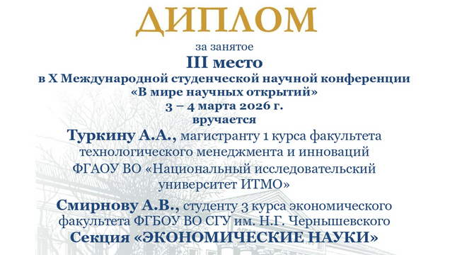 Студент 3-го курса Смирнов Алексей совместно с выпускником кафедры финансов и кредита СГУ, а ныне студентом 1 курса магистратуры факультета технологического менеджмента и инноваций ФГАОУ ВО «Национальный исследовательский университет ИТМО» Туркиным Андреем приняли участия в данном научном мероприятия. Они выступили в секции «ЭКОНОМИЧЕСКИЕ НАУК» с докладом на тему «Оценка эффективности инвестиций в жилую недвижимость с использованием ипотечного кредитования» (науч. рук. – ст. н.с. АННИО «ИПЭИ», к.э.н., доцент – Фенин К.В.). В нем они рассмотрели перспективу использования ипотечного кредитования квартиры в г. Москве, как инвестиционный проект и сравнили его с другими доступными инструментами. Доклад студентов вызвал сильную дискуссию по поводу расширения инструментария инвестирования. По результатам работы секции Смирнов Алексей и Туркин Андрей были награждены дипломом 3 степени.