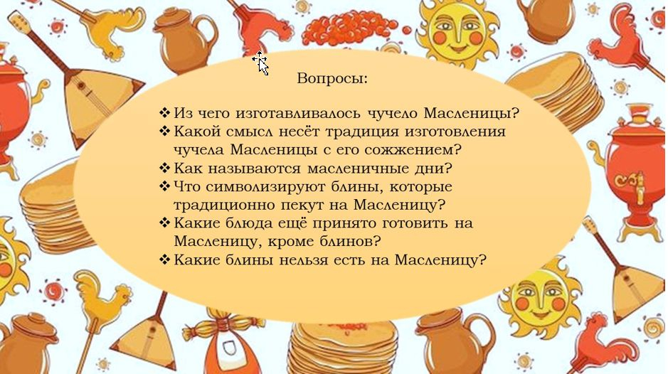 - организована интерактивная площадка. Участники мероприятия отвечали на вопросы: «Как называются масленичные дни?», «Какие блюда еще принято готовить на Масленицу?» и другие.
