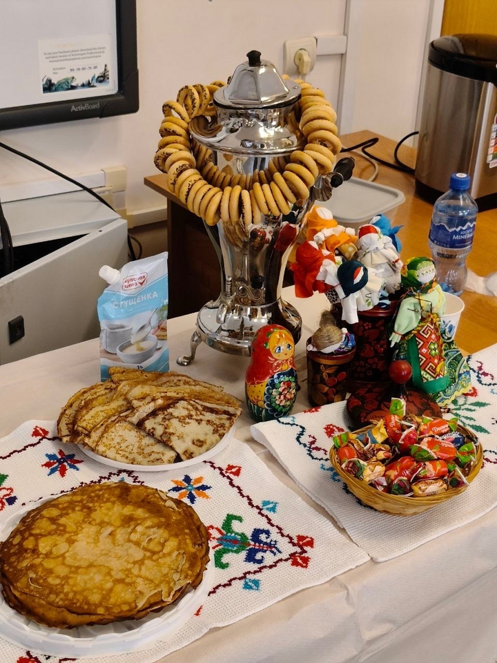- студенты – мастера перевоплощений. Каждый стол представил свое видение праздника: куклы «Маслёны», платки с народными узорами, расписные скатерти, матрешки, связки сушек.