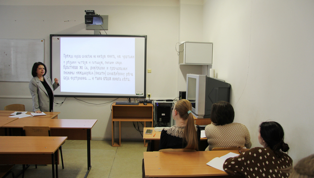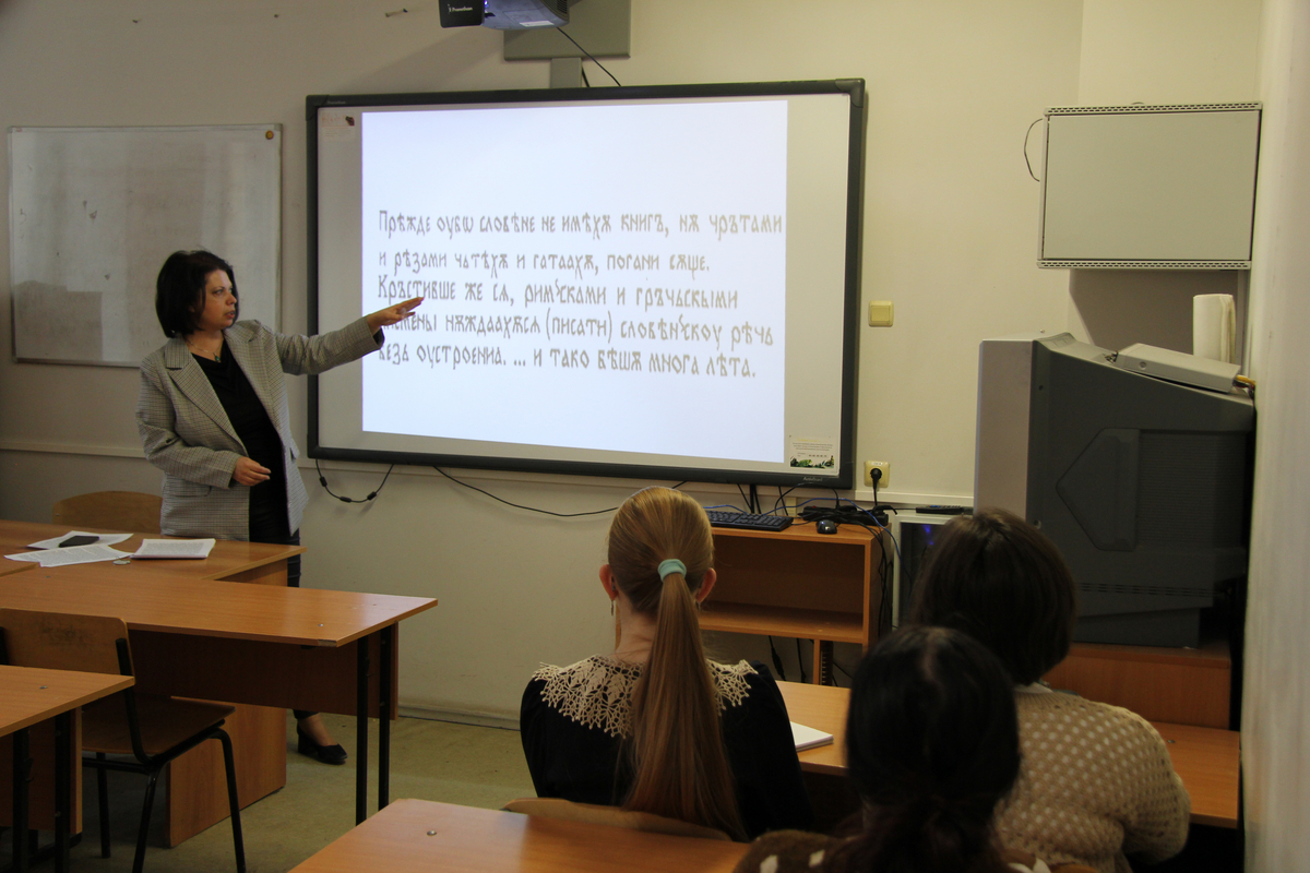 В среду, 25 февраля, в Клубе абитуриентов Института филологии и журналистики прошло занятие, посвящённое истории славянской письменности. Его провела кандидат филологических наук, доцент кафедры теории, истории языка и прикладной лингвистики Юлия Валерьевна Каменская.