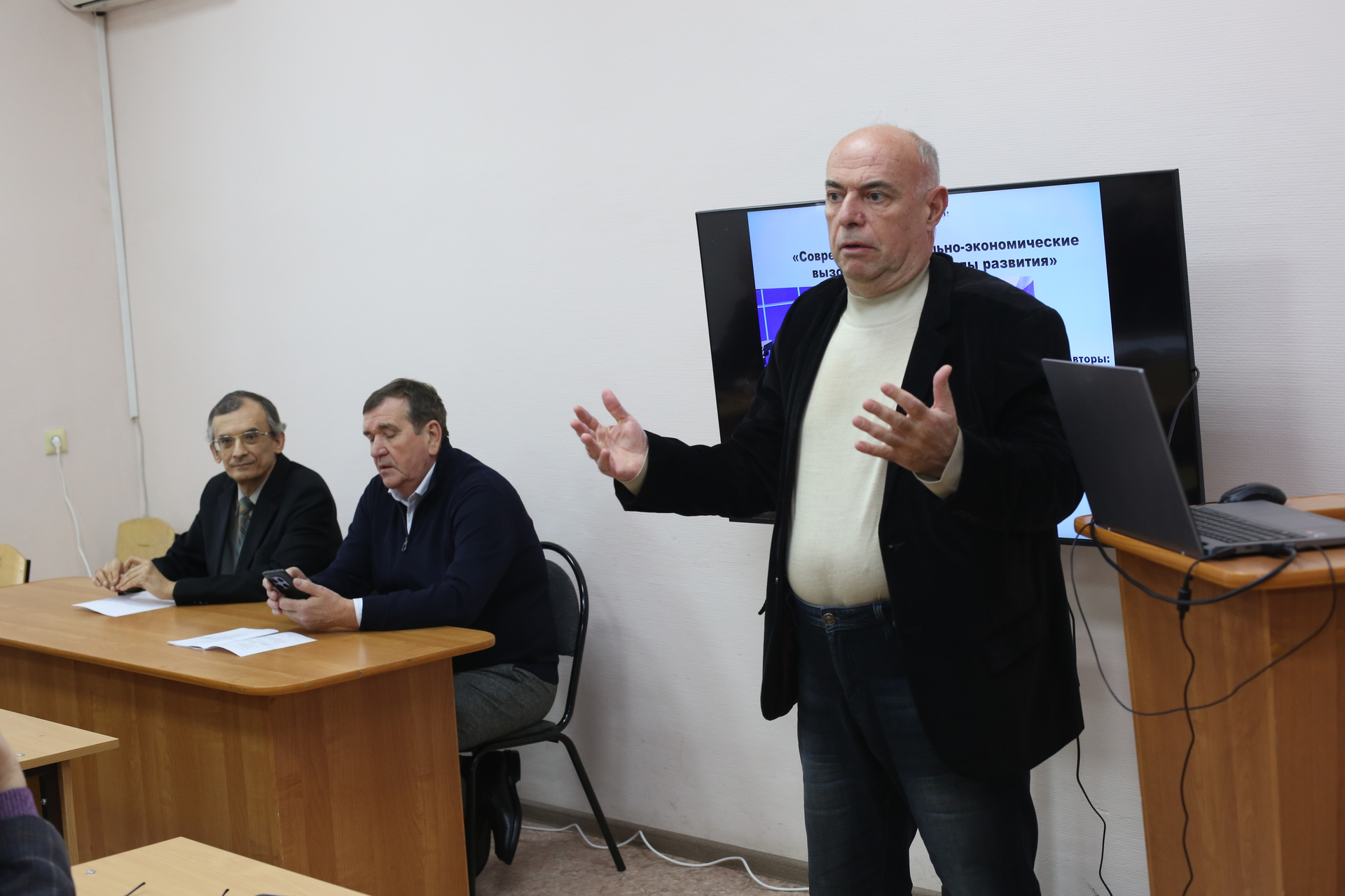 Пленарное заседание конференции началось с доклада доктора социологических наук, заведующего кафедрой корпоративной экономики Поволжского института управления имени П.А. Столыпина – филиала РАНХиГС при Президенте в городе Саратове Вадима Игоревича Малого и кандидата экономических наук, доцента кафедры корпоративной экономики Поволжского института управления имени П.А. Столыпина – филиала РАНХиГС при Президенте в городе Саратове Владимира Владимировича Гусева, остановившихся на мировых трендах современного социально-экономического развития. Доклад декана социологического факультета Самарского национального исследовательского университета имени С.П. Королева, заведующей кафедрой методологии социологических и маркетинговых исследований Светланы Вячеславовны Егоровой был посвящен анализу эффективности социальных контрактов с малоимущими гражданами в контексте междисциплинарных исследований. Доцент кафедры социологии молодежи социологического факультета Саратовского государственного университета имени Н.Г. Чернышевского Александр Анатольевич Кошелев представил концептуализацию понятия, типологию, коммерческие и общественные эффекты функционирования цифровых социально-экономических экосистем в условиях платформизации экономики. Проблемы генеративного искусственного интеллекта в цифровой среде университета нашли отражение в докладе заведующего лабораторией социологических исследований и информатики социологического факультета Саратовского государственного университета имени Н.Г. Чернышевского Андрея Анатольевича Фомина.