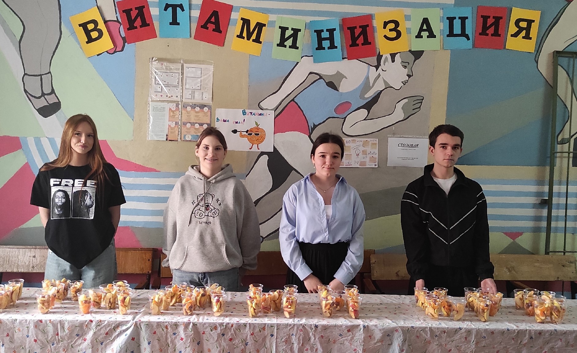 Активисты студсовета подготовили стаканчики с витаминами: яблоки, мандарины и виноград, креативно выстроили их в слова – ВИТАМИН КРЭ и на большой перемене под «драйвовую» музыку раздавали студентам. Все происходящее было произведено в соответствии с нормами СанПиН.