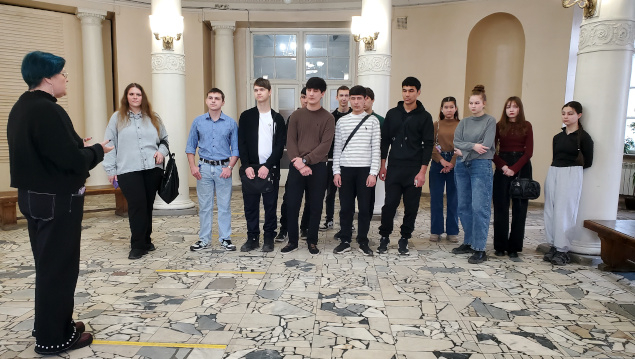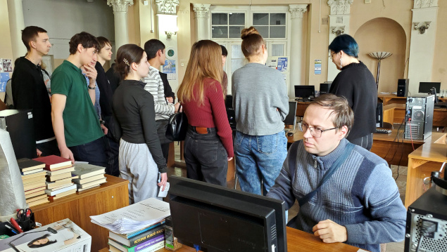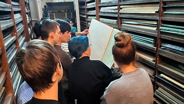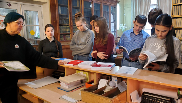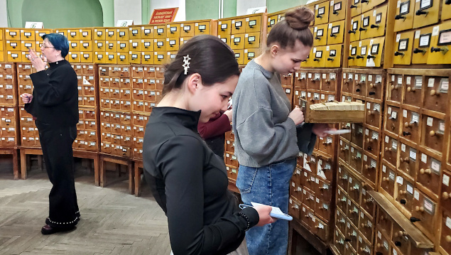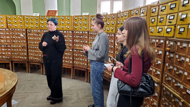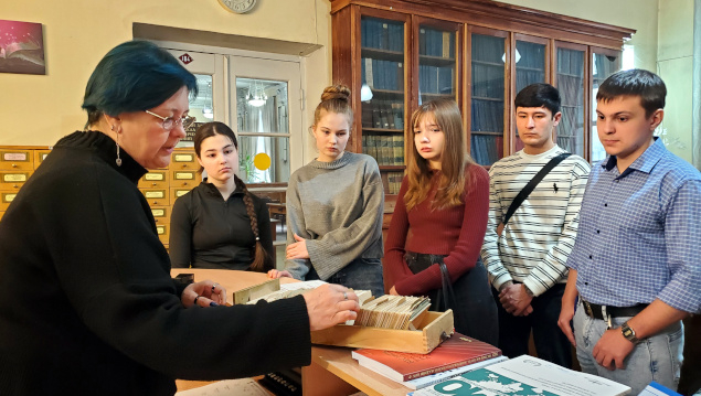 Далее студенты посетили зал каталогов, где познакомились с организацией карточных каталогов (алфавитных, систематического), системой поиска и заказа книги через читальный зал научных работников и абонемент. В книгохранилище экскурсанты увидели, как хранятся книги.