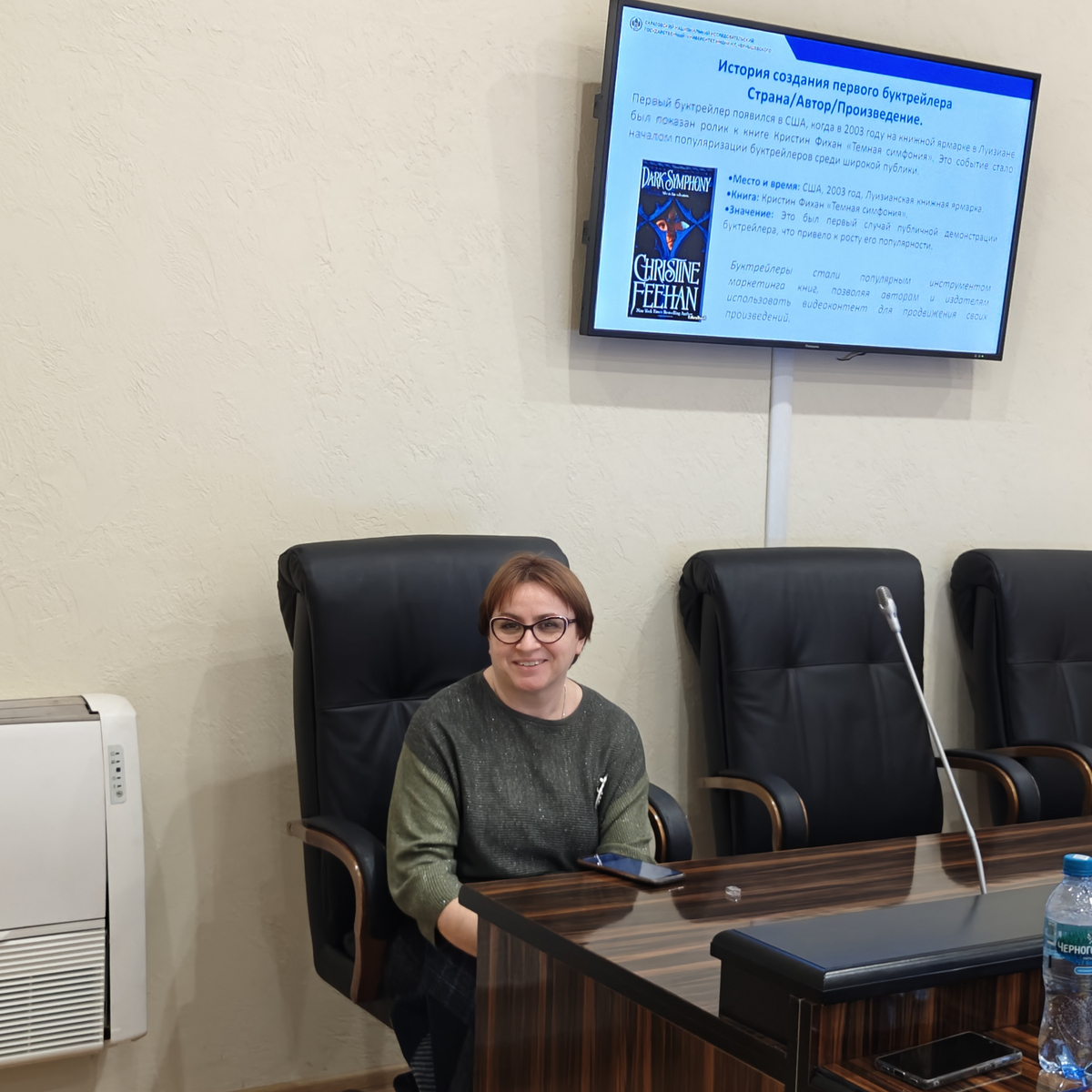 Наталья Алексеевна Кубракова, зав. кафедрой английского языка для гуманитарных направлений и специальностей, познакомила участников мастер-класса с различными способами повышения воздействующего потенциала буктрейлеров и продемонстрировала возможные варианты использования этих способов на примере буктрейлеров, созданных участниками конкурса прежних лет.