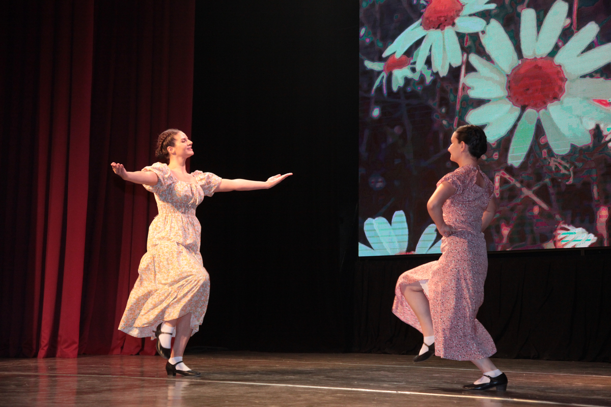 Весёлые улыбки и лёгкие шаги коллектива народного танца «Меридиан» напомнили зрителям о немногочисленных светлых моментах в ожидании возвращения мира. Задорная музыкальная композиция задала настроение выступлению дуэта девушек в платьях с цветочным узором, стилизованных под сороковые годы.