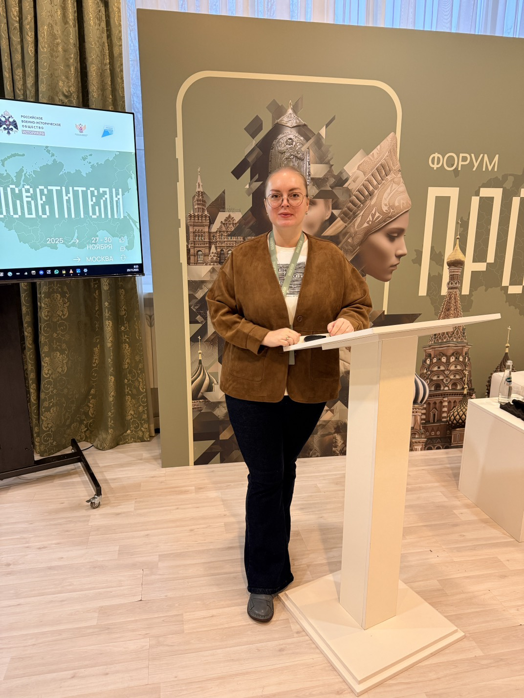 27-30 ноября в Москве прошел федеральный форум «Просветители», инициированный Российским военно-историческим обществом и помощником Президента РФ В. Р. Мединским. Форум собрал авторов единого учебника истории, популяризаторов исторической науки, ученых-исследователей, а также учителей-блогеров. Ассистент кафедры истории России и археологии, к.и.н. Анна Дмитриевна Аукштыкальните в рамках форума представила общественности свой просветительский проект, размещенный в сети «В контакте» и нацеленный на популяризацию исторического знания среди молодежи и взрослого поколения. Также она приняла участие в записи видео к интерактивному проекту «Учебник истории».