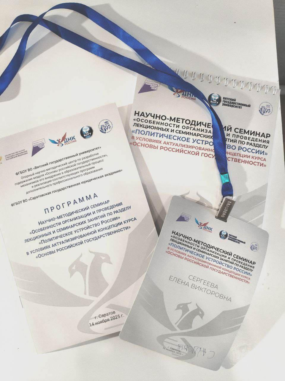 14 ноября 2025 года в Саратовской государственной юридической академии состоялся научно-методический семинар «Особенности организации и проведения лекционных и семинарских занятий по разделу “Политическое устройство России”». Мероприятие было организовано Опорным научно-методическим центром по разработке содержания модуля «Основы российской государственности» Вятского государственного университета.