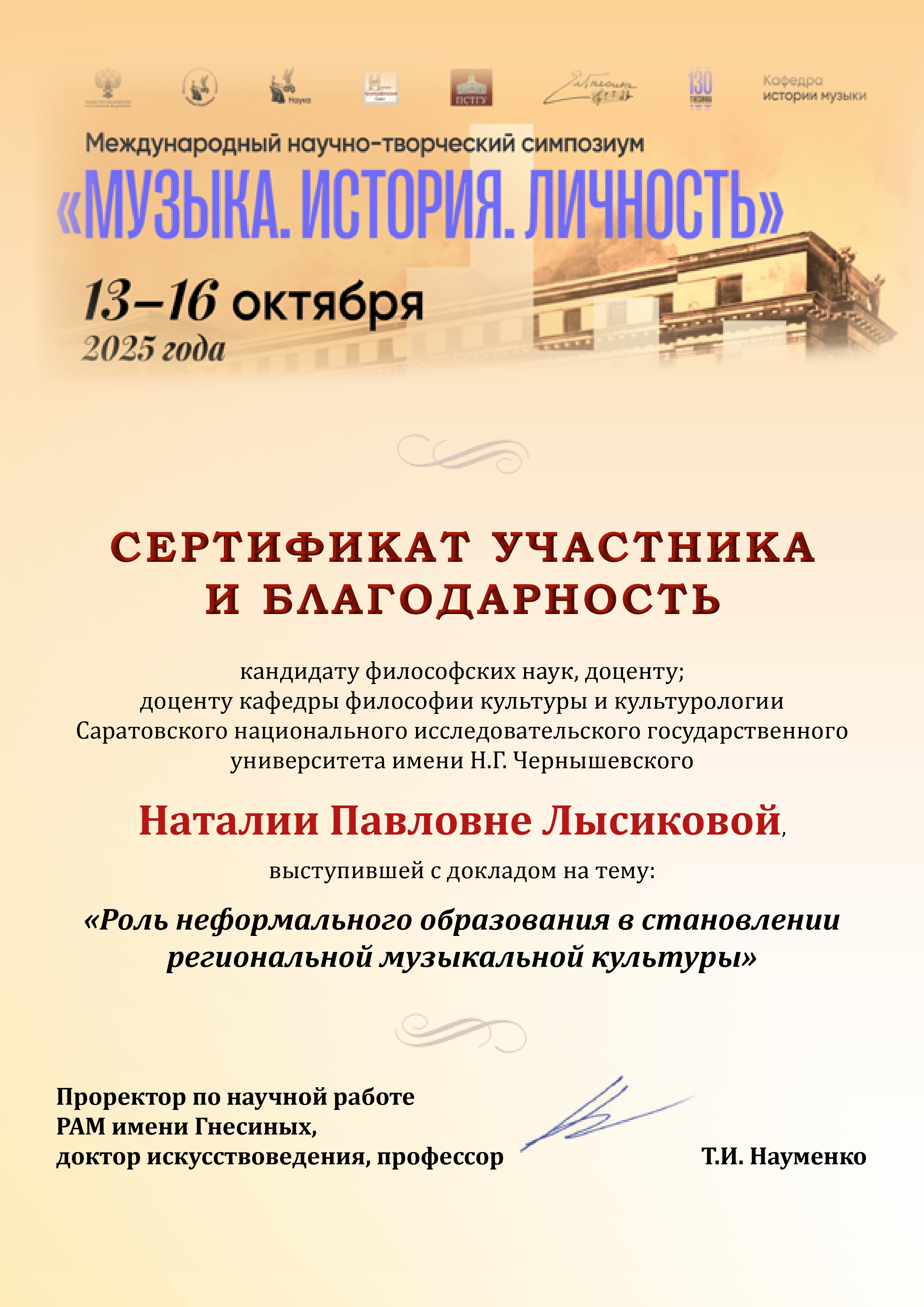 В мероприятии приняла участие доцент кафедры философии культуры и культурологии, кандидат философских наук Наталия Павловна Лысикова, выступившая на круглом столе «Опыт и инновации в преподавании музыкально-исторических дисциплин» с докладом «Роль неформального образования в становлении региональной музыкальной культуры», отмеченным со стороны организаторов благодарностью и сертификатом. По итогам симпозиума планируется выпуск сборника научных статей.