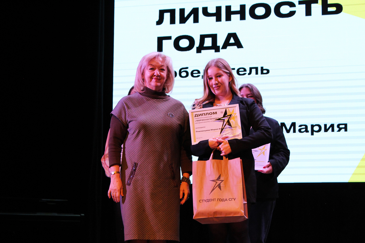 Вручила награды призёрам исполняющая обязанности председателя Совета студентов и аспирантов СГУ Кира Макаричева.