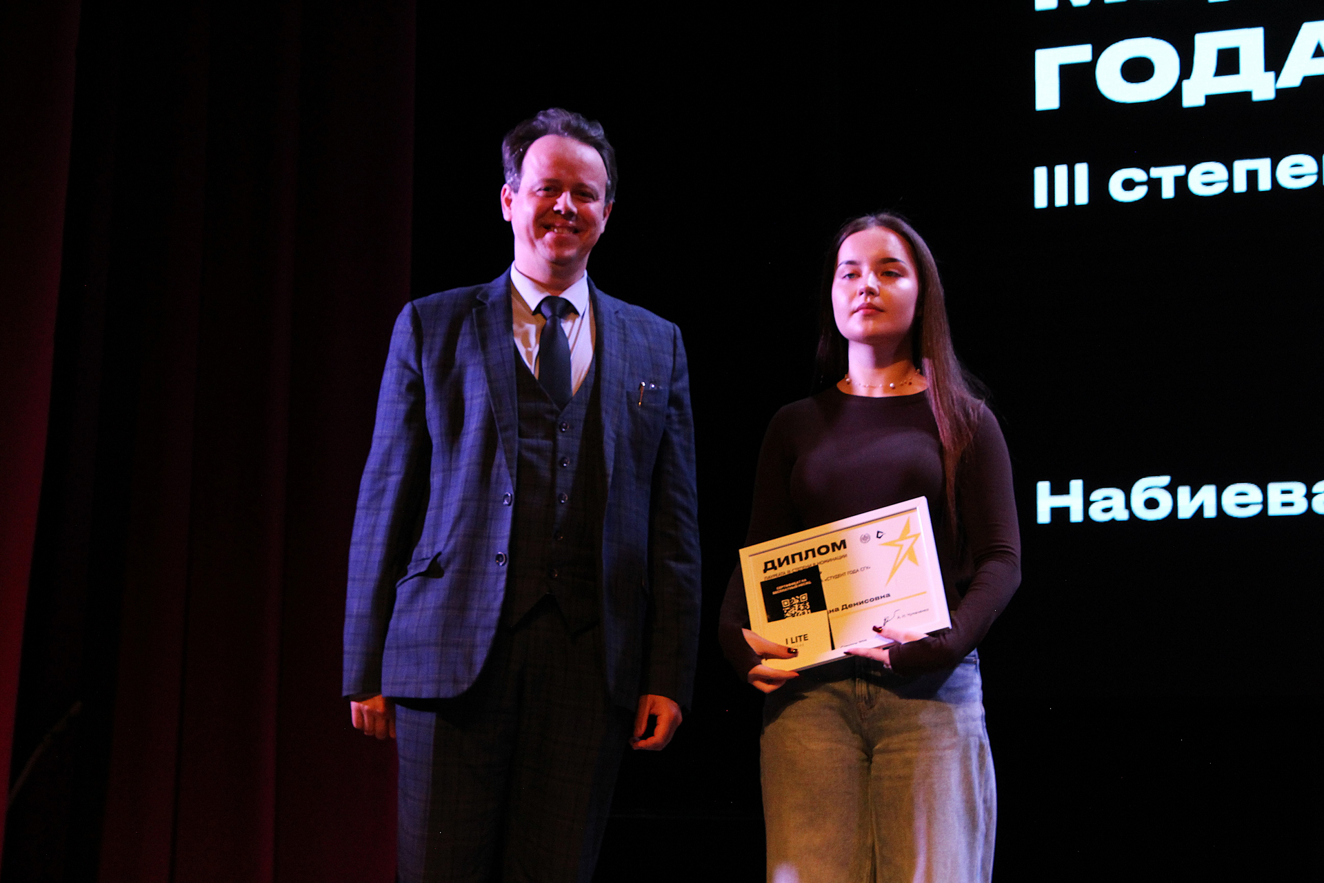 Алексей Николаевич наградил абсолютного победителя конкурса «Студент года – 2025» – студента факультета физико-математических и естественно-научных дисциплин Педагогического института Артёма Сахипова.