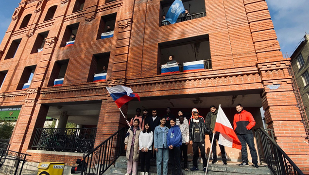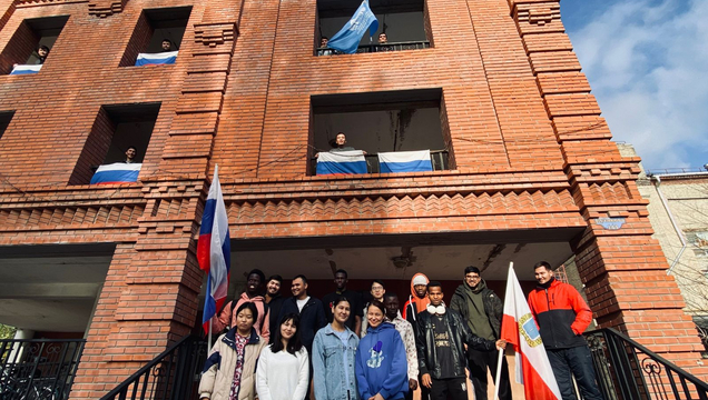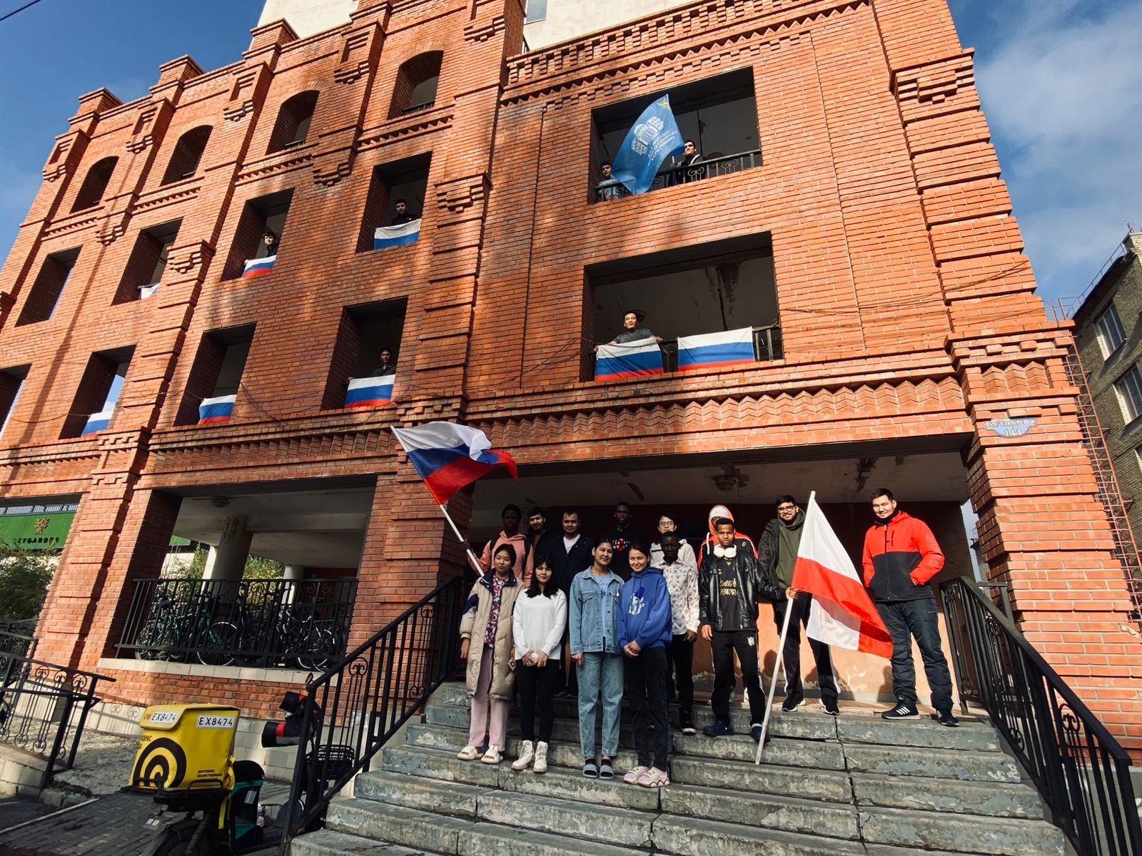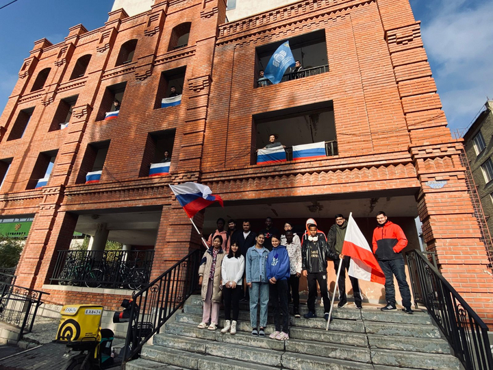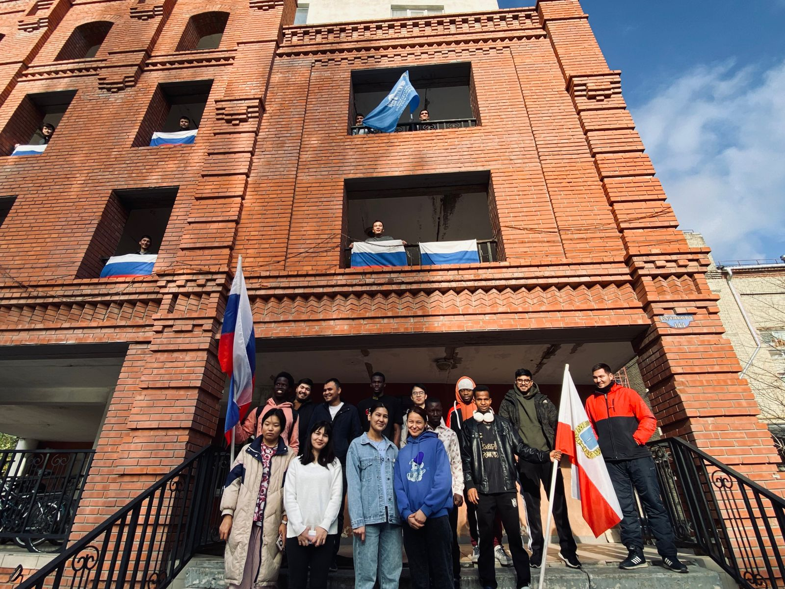Иностранные обучающиеся СГУ из Того, Нигерии, Гвинеи, Туркменистана, Ирака, Республики Конго украсили общежитие №1 флагами России к празднованию Дня народного единства, которое состоится 4 ноября.