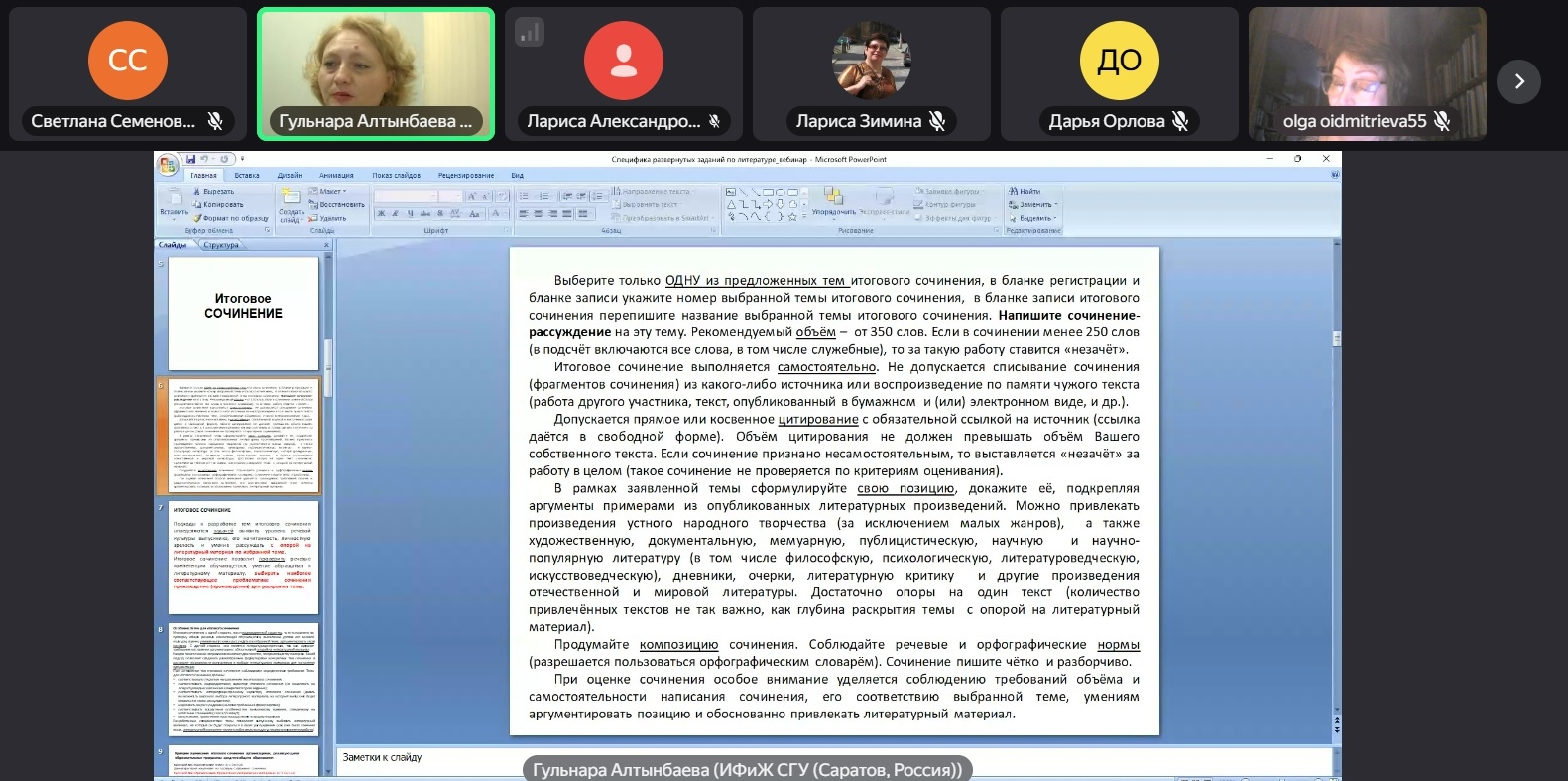 Первый вебинар «Специфика развернутых заданий по литературе в формате итоговой аттестации в 9 и 11 классах» (5 ноября) провела Гульнара Монеровна Алтынбаева, доктор филологических наук, профессор. Она охарактеризовала развернутые задания по литературе в формате итоговой аттестации в 9 и 11 классах (ОГЭ, ЕГЭ, итоговое сочинение). Включение в качестве материала для анализа текстов итоговых сочинений школьников усилило практическую значимость разговора. В ходе вебинара участники могли высказываться и задавать вопросы.