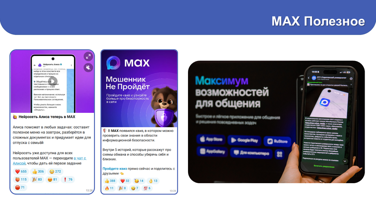 Сейчас редакция ориентируется на публикацию новостей науки и образования, оперативные объявления. Журналисты рассказывают о том, чем полезен MAX, регулярно и оперативно репостят важные новости из канала Минобрнауки, из канала председателя Государственной Думы В.В. Володина, делятся атмосферными фото кампуса, продолжают давать анонсы и дайджесты.