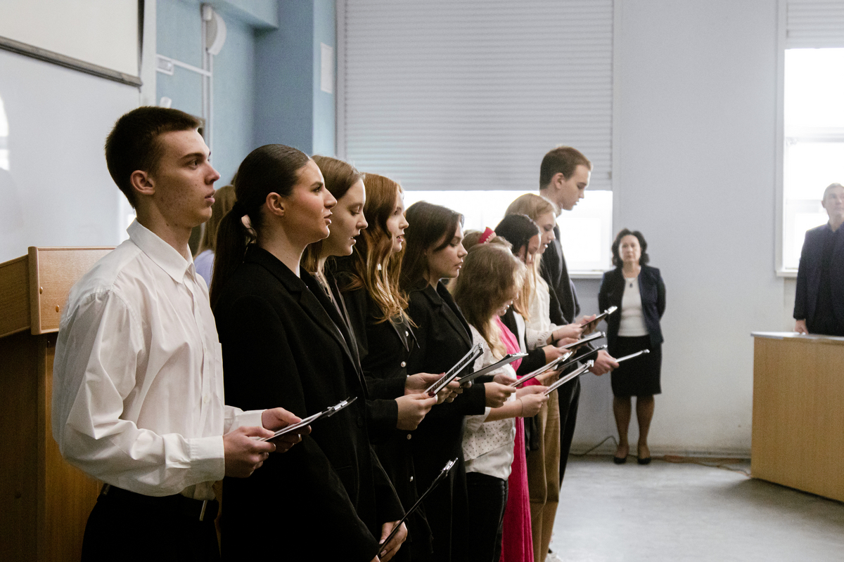 У студентов 1950-х был свой корпоративный гимн, который они бережно передали другим поколениям. Сегодняшние студенты-мехматовцы восстановили его и спели вместе с гостями торжества.