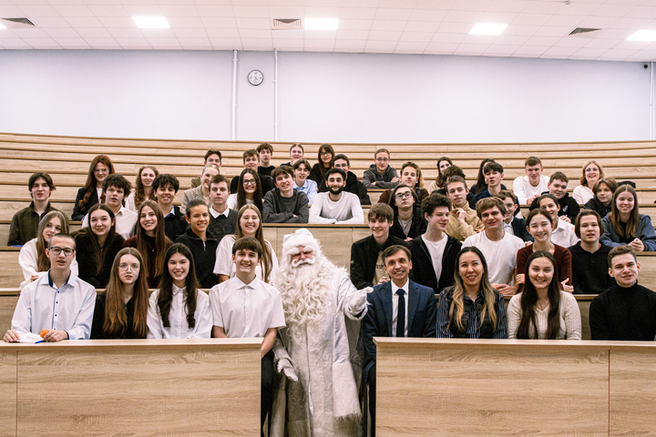 На площадке Института физики состоялось заключительное в уходящем году занятие Школы технологического лидерства для старшеклассников. Программа объединила серьёзную научную составляющую и праздничную предновогоднюю атмосферу.