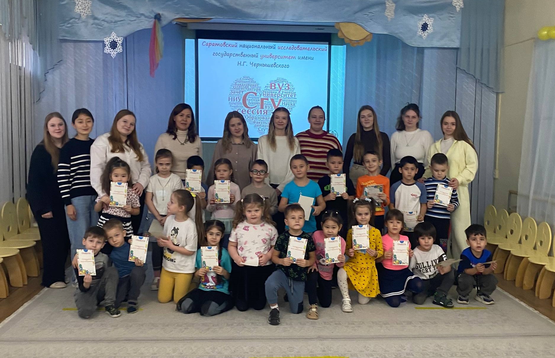 Полина Буренина, Кристина Вуткарева, Мария Запасчикова, Елизавета Непомящая, Анастасия Полуцыган, Надежда Фенченко под руководством доцента кафедры методологии образования Ольги Анатольевны Козловой превратили обычный день в детском саду в большое приключение: доступным языком рассказали детям о Саратовском университете: объяснили, что такое ВУЗ, зачем туда поступают, и каково это - быть студентом. Теперь «студент» и «университет» для дошкольников не просто абстрактные понятия, а интересная перспектива.