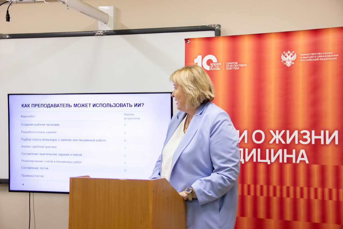 Куликова Светлана Анатольевна, д-р юрид. наук, профессор кафедры конституционного и муниципального права Саратовского национального исследовательского государственного университета имени Н.Г. Чернышевского представила доклад, в котором использование ИИ в образовательном процессе рассматривалось со стороны преподавателя и студента. Докладчик остановилась на рисках и положительных сторонах использования ИИ при проведении различных форм обучения.