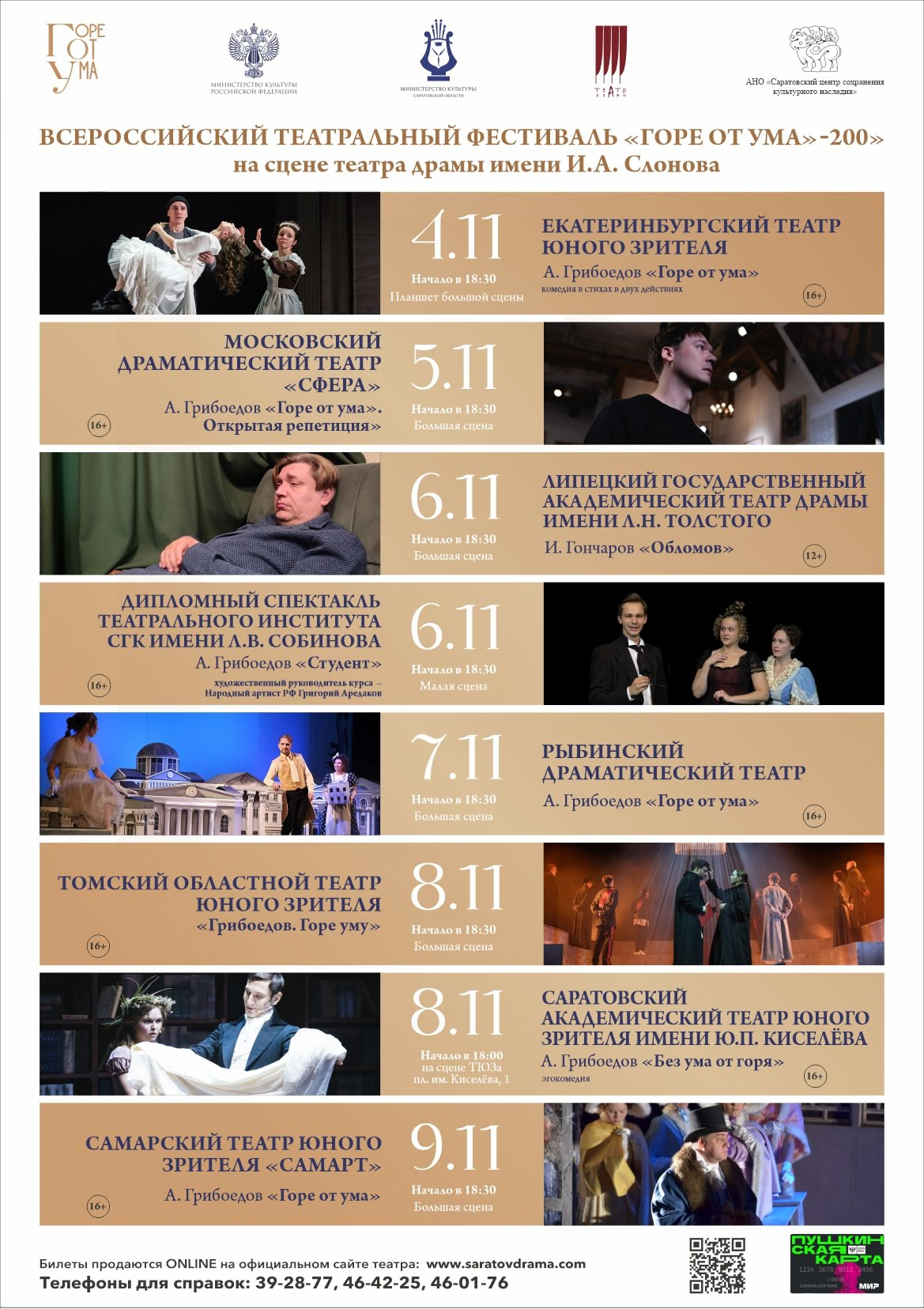 С 4 по 9 ноября в Саратове пройдёт Всероссийский театральный фестиваль «Горе от ума – 200», приуроченный к 200-летию произведения великого русского писателя Александра Сергеевича Грибоедова.