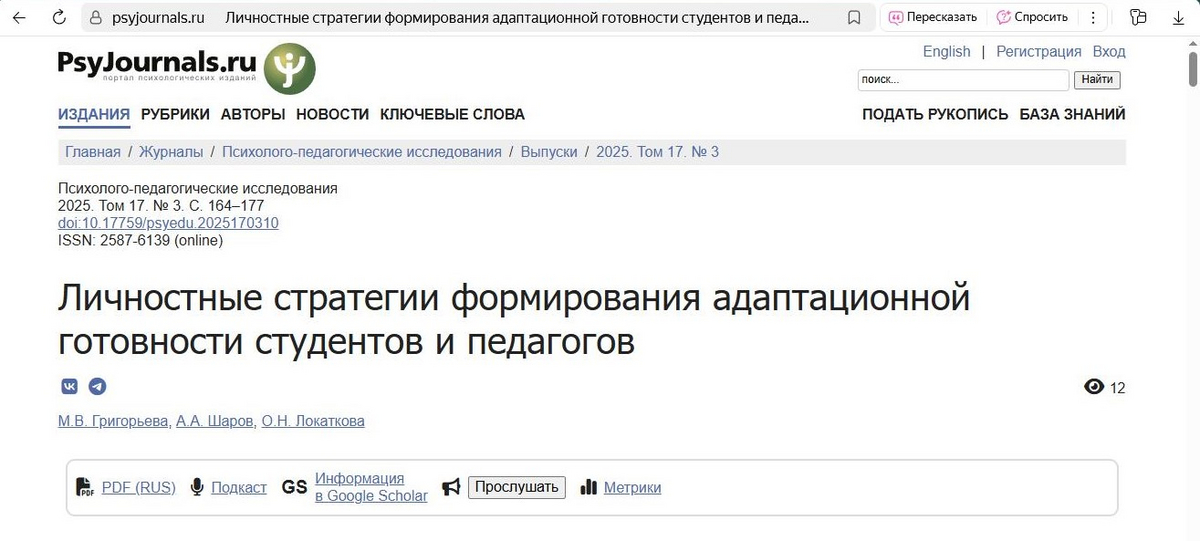 Результаты проведенного эмпирического исследования опубликованы в третьем номере 2025 года журнала «Психолого-педагогические исследования» (входит в «Белый список» научных журналов и Ядро РИНЦ, индексируется в Russian Science Citation Index).