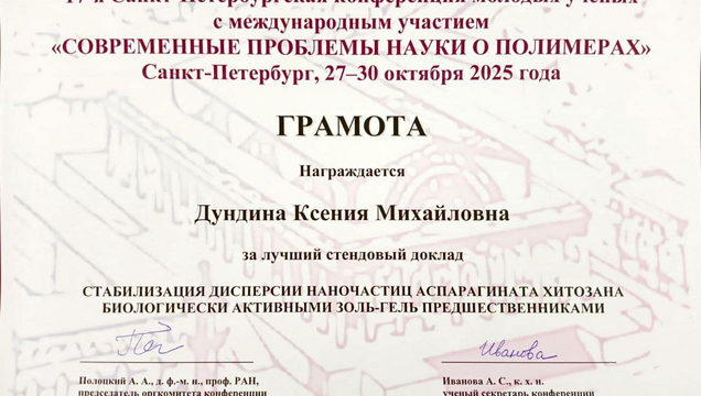 Работа «Стабилизация дисперсии наночастиц аспарагината хитозана биологически активными золь-гель предшественниками» аспирантки Института химии Дундиной Ксении Михайловны (научный руководитель Шиповская А.Б.) оценена грамотой за лучший стендовый доклад в секции «Биополимеры и полимеры медицинского назначения».