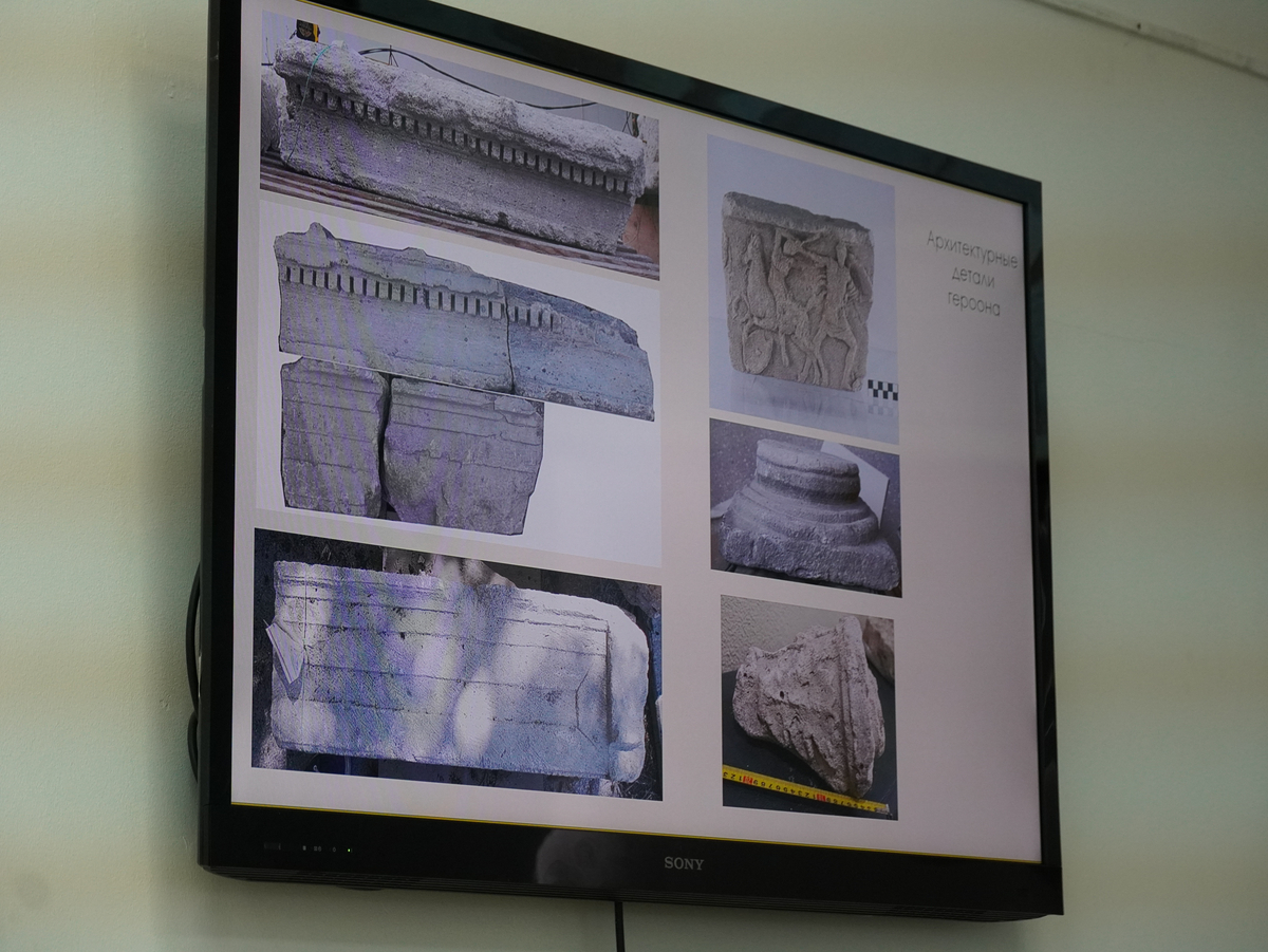 Выступление старшего научного сотрудника центра спасательной археологии Института истории материальной культуры РАН С.Л. Соловьёва было посвящено опыту музеефикации архитектуры южного пригорода Херсонеса. С мая 2021 года по сентябрь 2023 года ИИМК РАН при поддержке фонда «Моя история» и Минобороны России проводили масштабные археологические исследования в Южном пригороде древнего города Херсонес Таврический. В ходе экспедиции было открыто большое количество уникальных погребальных комплексов. Например, героон – уникальная монументальная ордерная постройка первой половины IV века до нашей эры, в нижней части которой находился саркофаг с останками; толос – круглая в плане постройка, внутри которой был обнаружен каменный сосуд со свинцовой погребальной урной; колумбарий и экседра-склеп.