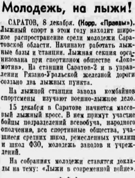 Большое внимание по-прежнему уделяется военной подготовке. Об этом пишут газеты «Правда» и «Известия» от 9, 10, 11 декабря. Организованы лыжные базы, изучается военно-лыжное дело, налажено производство лыж промысловыми артелями Саратова и Петровского, Балтайского, Черкасского районов Саратовской области. В Саратове, Аткарске, Базарном Карабулаке, Марксштадте, Красном Куте, Аркадаке и Пугачеве идет ускоренная подготовка инструкторов лыжного спорта. Под их руководством несколько тысяч юношей и девушек будут овладевать военно-физкультурным делом. 15 декабря в Саратове начинается массовый лыжный кросс. Эскадрон конников и батальон лыжников организованы в селе Матвеевке Балаковского района Саратовской области. Кавалеристами эскадрона командует командир запаса коммунист Кулаков. Осваивая кавалерийское дело, конники одновременно изучают боевую винтовку, станковый пулемет и тактику ближнего боя. [1, 2, 5, 6].