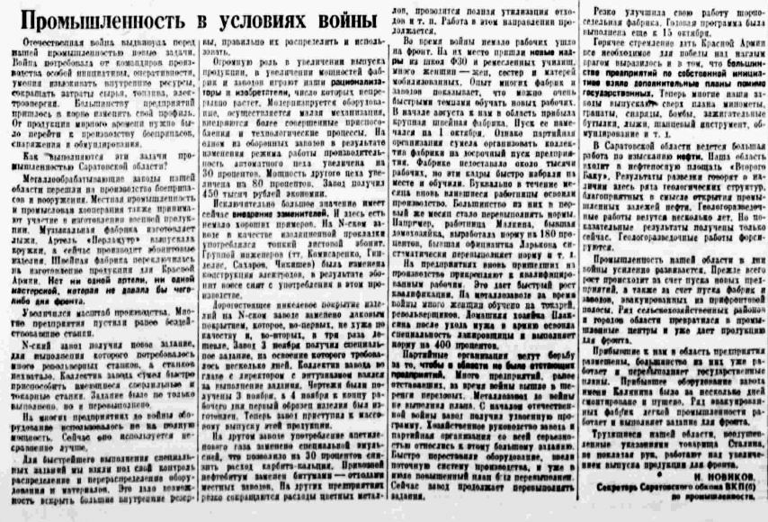 Секретарь Саратовского Обкома ВКП (б) по промышленности Н. Новиков в большой статье «Промышленность в условиях войны» («Правда» от 12 декабря) анализирует результаты перестройки промышленности на военный лад. Это увеличение масштабов производства, эффект от рационализаторских предложений и изобретений, внедрение заменителей, приток молодых кадров, налаживание работы эвакуированных предприятий [7, 8].