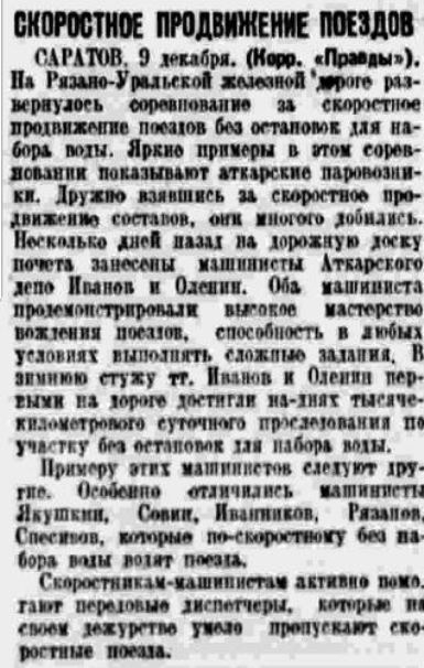 На Рязано - Уральской железной дороге развернулось соревнование за скоростное продвижение поездов без остановок для набора воды, информирует «Правда» от 10 декабря. На дорожную доску почёта занесены машинисты Аткарского депо тт. Иванов и Оленин, первыми на дороге достигшие тысячекилометрового суточного проследования по участку без набора воды. За ними последовали и другие машинисты. Им активно помогают диспетчеры [4].