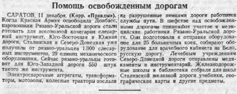 Паровозники Рязано - Уральской дороги передали железнодорожникам освобожденного Донбасса инструменты, оборудование, медикаменты, учебники. («Правда» от 12 декабря) [27].
