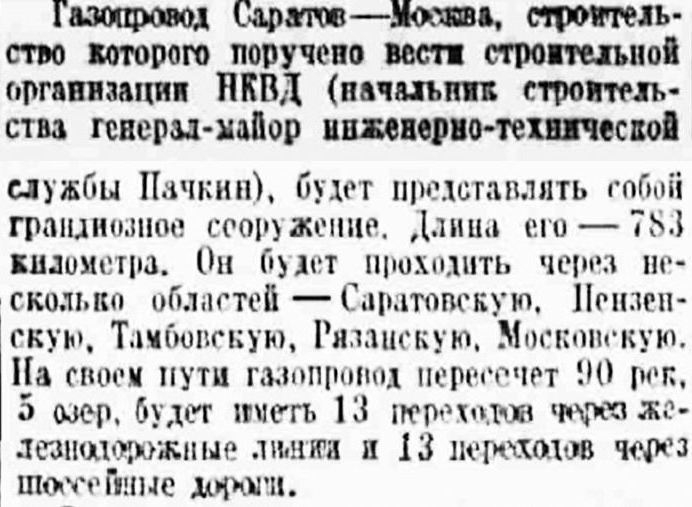 Открытие газовых месторождений в Саратове позволит обеспечить нужды не только региона, но и центральных районов. Председатель исполкома Московского Совета Г. Попов в статье «Газопровод Саратов — Москва» («Правда» от 11 декабря) говорит о принятом правительством решении о строительстве газопровода со сроком окончания строительства в декабре 1945 года, о его значении, сложности воплощения, необходимости подготовки кадров, создания инфраструктуры для изготовления аппаратуры, распределительных станций [32].
