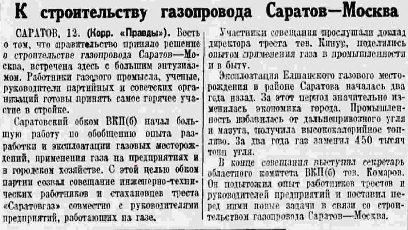 Весть о строительстве газопровода Саратов — Москва, встречена в Саратове с большим энтузиазмом («Правда» от 13 декабря). Работники газового промысла, ученые, руководители партийных и советских организаций, имея двухлетний опыт эксплуатации месторождений, готовы принять самое горячее участие в стройке [34].