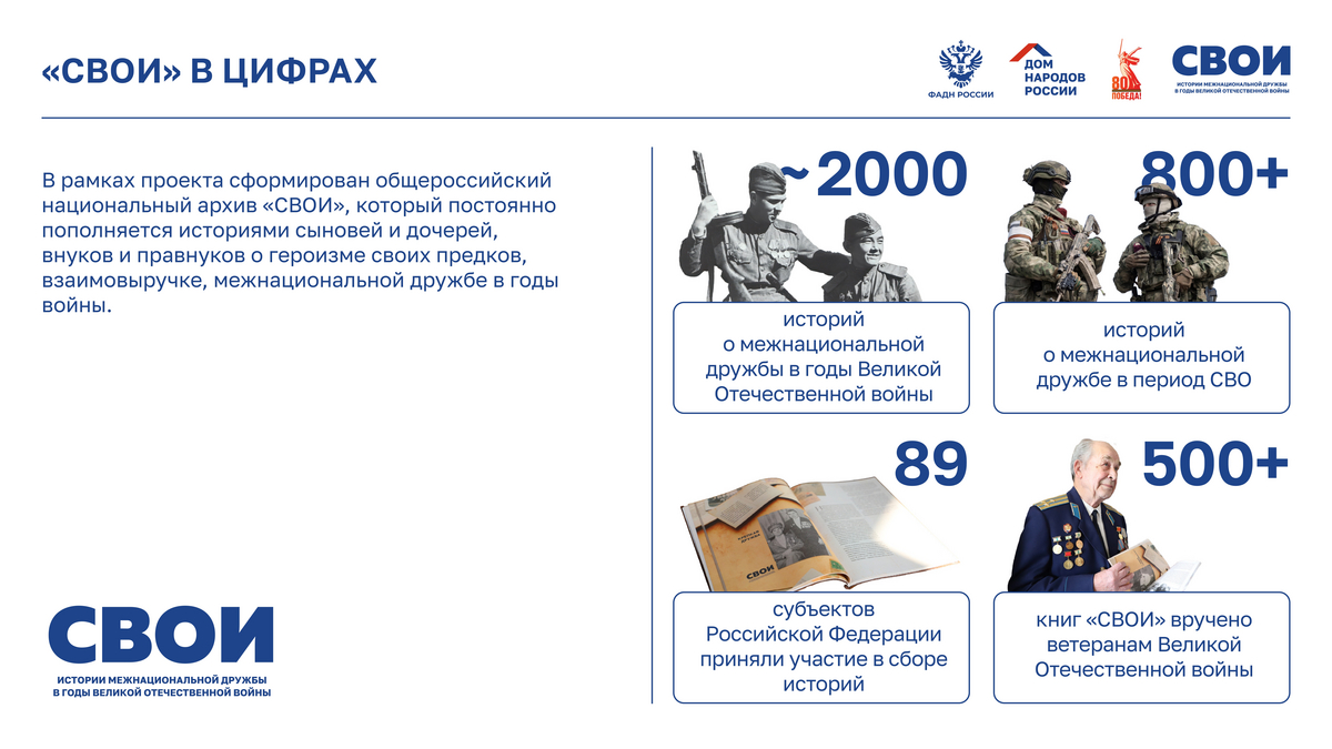 В 2025 году в рамках проекта будет издана книга «СВОИ», в которую войдут 80 самых интересных историй. В Год защитника Отечества одна из глав книги будет посвящена историям потомков победителей. Тем, кто сегодня в зоне СВО продолжают дело дедов и прадедов. Проект «СВОИ» реализуется также в формате интерактивных выставок. В этом году выставки о межнациональной дружбе в годы Великой Отечественной войны и в период СВО откроются по всей России.