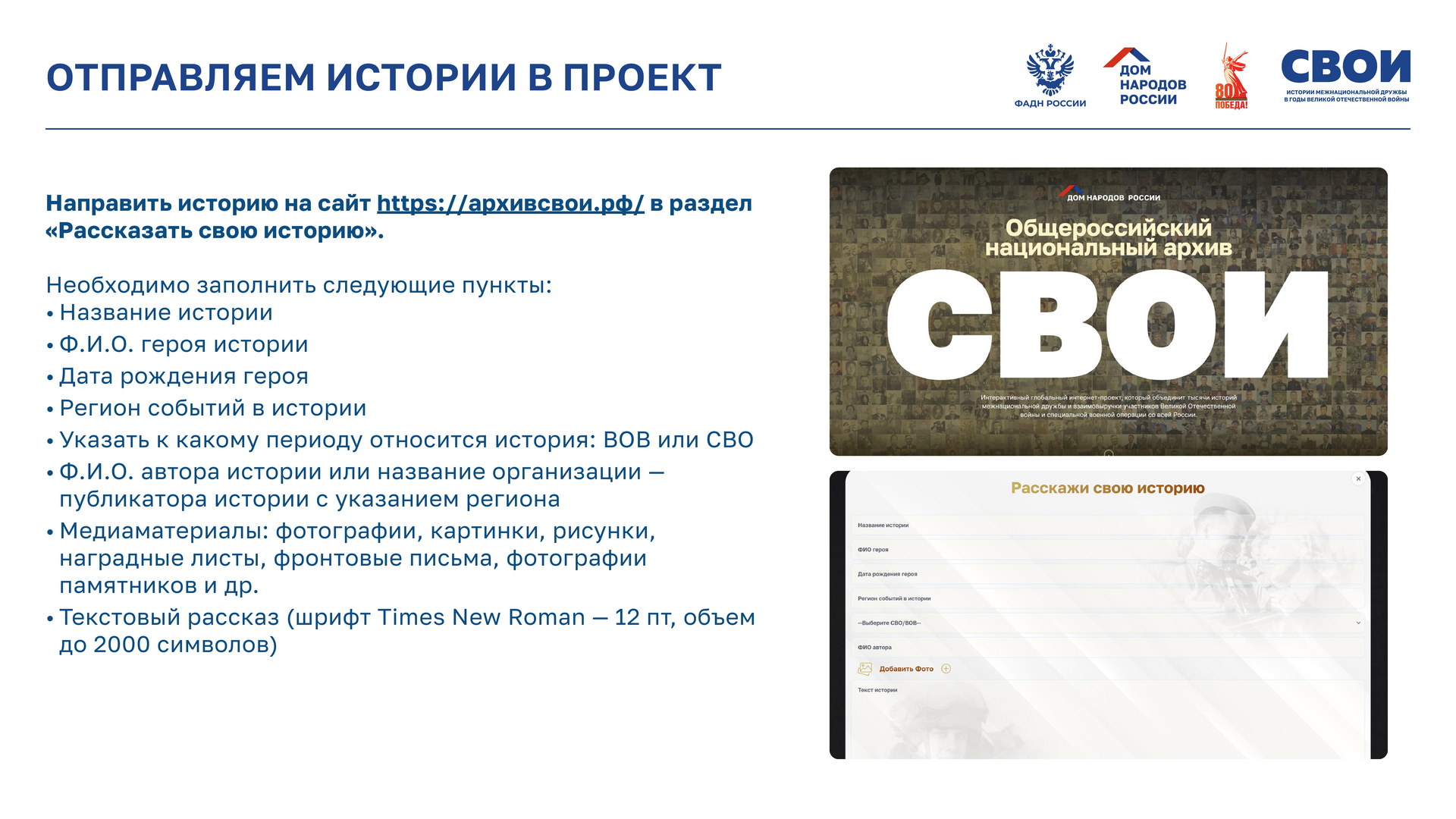 Для включения вашей истории в проект необходимо направить материалы на почту svoi@domnarodov.ru.