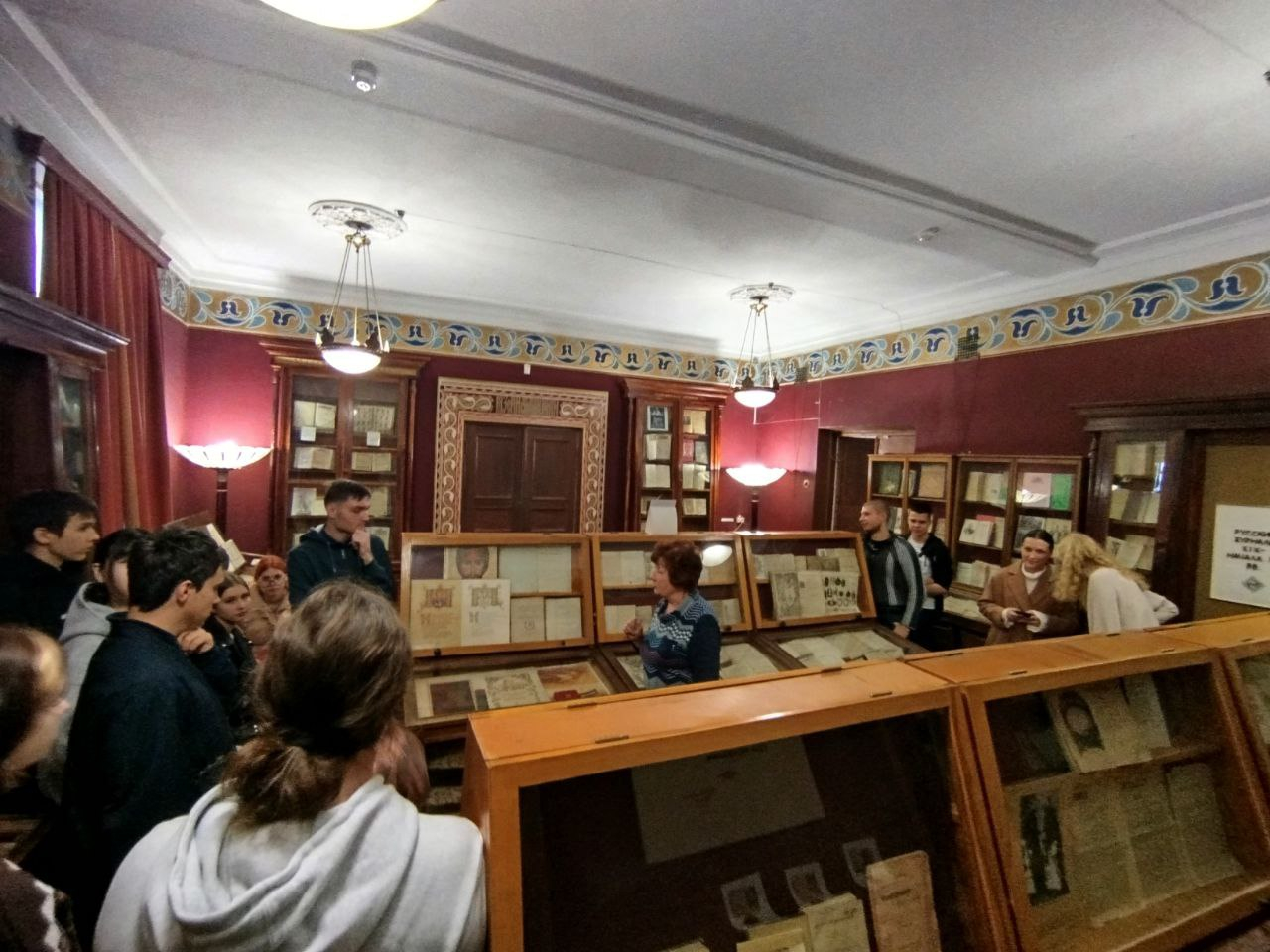 На выставке по истории русской книги студенты узнали об особенностях рукописных и старопечатных изданий, о журналах екатерининского, петровского времени и Серебряного века, увидели издания с автографами, познакомились с особенностями формирования фонда отдела редких книг и рукописей, услышали о коллекционерах-дарителях.