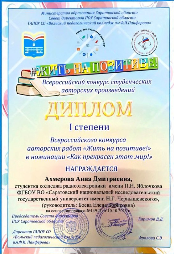 С 15 октября по 14 ноября 2025 года проходил Всероссийский конкурс студенческих авторских произведений «ЖИТЬ НА ПОЗИТИВЕ!». Целями конкурса являлись: развитие творческого потенциала талантливых обучающихся профессиональных образовательных учреждений; приобщение студентов к процессу создания уникальных текстов; формирование позитивной установки на здоровый образ жизни, умения выражать свои мысли и чувства, личное отношение к окружающему; привлечение внимания к проблемам гражданско-патриотического и духовно-нравственного воспитания; осознание значимости выбранной профессии.