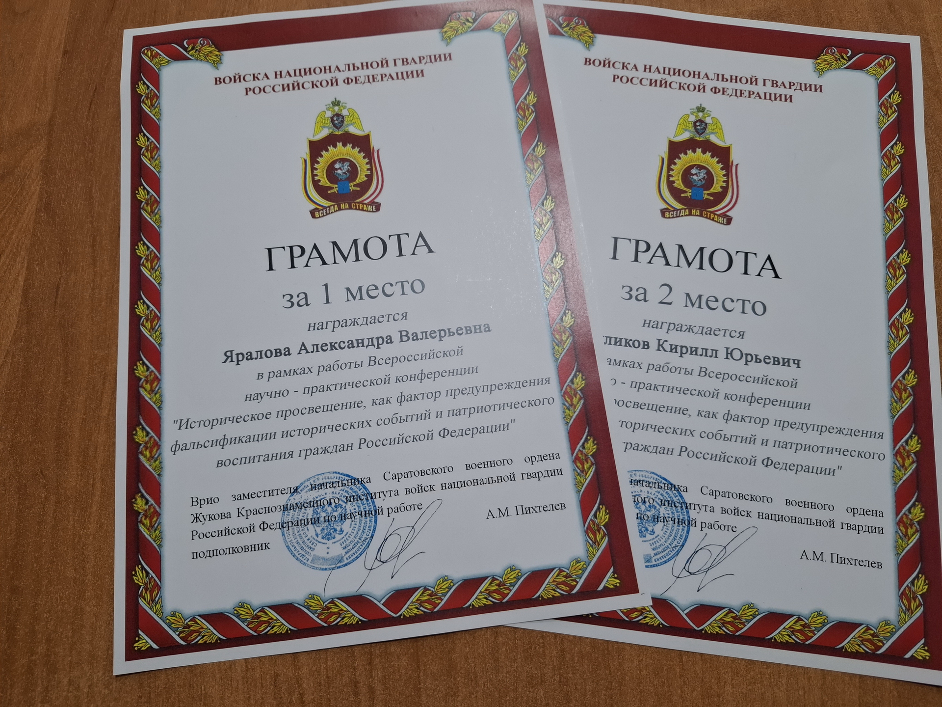 28 октября преподаватели и студенты юридического факультета приняли участие во Всероссийской научно - практической конференции «Историческое просвещение как фактор предупреждения фальсификации исторических событий и патриотического воспитания граждан Российской Федерации». Конференции прошла в Саратовском военном ордена Жукова Краснознамённом институте войск национальной гвардии РФ.