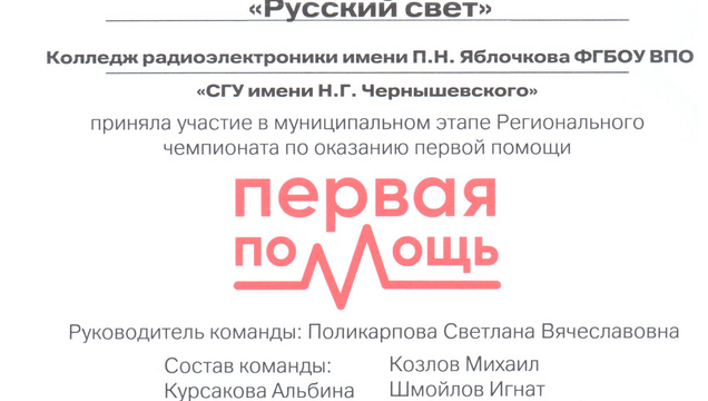 16 октября 2025 года команда Колледжа радиоэлектроники имени П.Н.Яблочкова «Русский свет» приняла участие в муниципальном этапе Всероссийского проекта «Первая помощь». Это один из флагманских проектов Движения Первых.