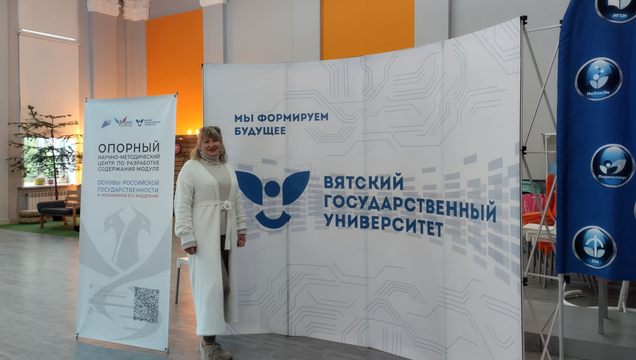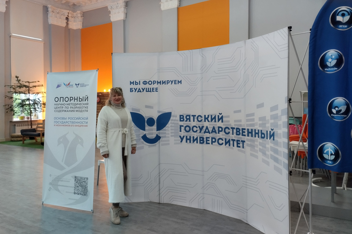 С 25 по 26 сентября 2025 года в Вятском государственном университете состоялась программа повышения квалификации «Акценты курса “Основы российской государственности” в 2025-2026 гг.» для преподавателей вузов Приволжского федерального округа. Философский факультет представила ответственная за воспитательную работу, доцент кафедры теологии и религиоведения Маргарита Владимировна Каткова.