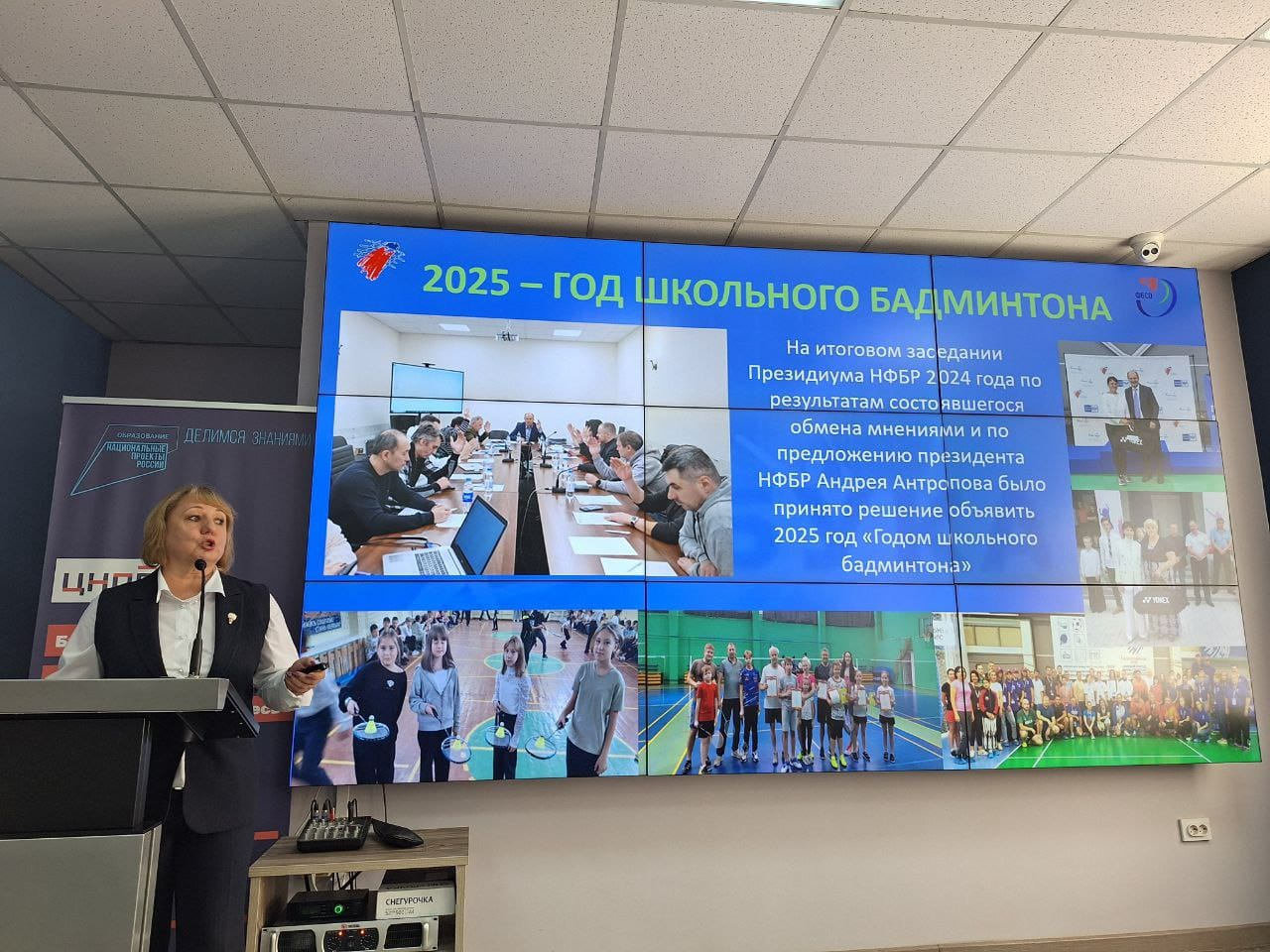 С приветственным словом выступила Инна Зубова, вице-президент Национальной федерации бадминтона России и ответственный за комиссию по развитию школьного спорта НФБР. Она отметила важность развития школьного бадминтона и обозначила ключевые задачи региональных федераций.