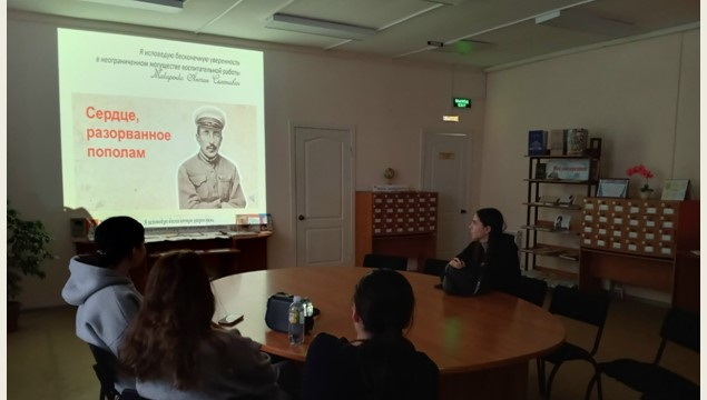 Будущие педагоги (химики) с интересом посмотрели презентацию о жизни и творчестве А. С. Макаренко «Сердце, разорванное пополам», в которую были включены отрывки из фильмов «Путёвка в жизнь», «Педагогическая поэма», «Республика ШКИД», «Флаги на башнях», повествующие о жизни брошенных детей. Материалы выставки «Я исповедую бесконечную уверенность в неограниченном могуществе воспитательной работы» познакомили студентов с изданиями самого А. С. Макаренко и материалами о жизни и творчестве педагога.