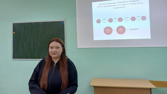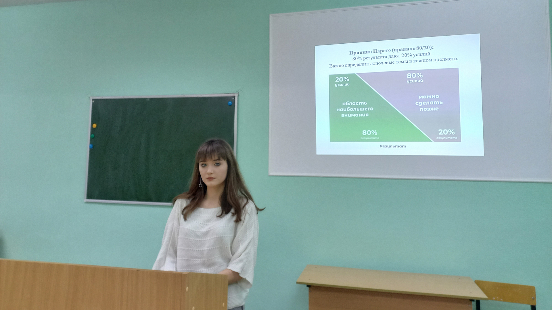 Встреча прошла в формате живого диалога, где теория сразу же подкреплялась практическими советами. Студенты говорили об инструментах тайм-менеджмента, о принципе Парето, методе «Помидора» и матрице Эйзенхауэра, которые помогают расставлять приоритеты, бороться с прокрастинацией и составлять реалистичный план подготовки к экзаменам.