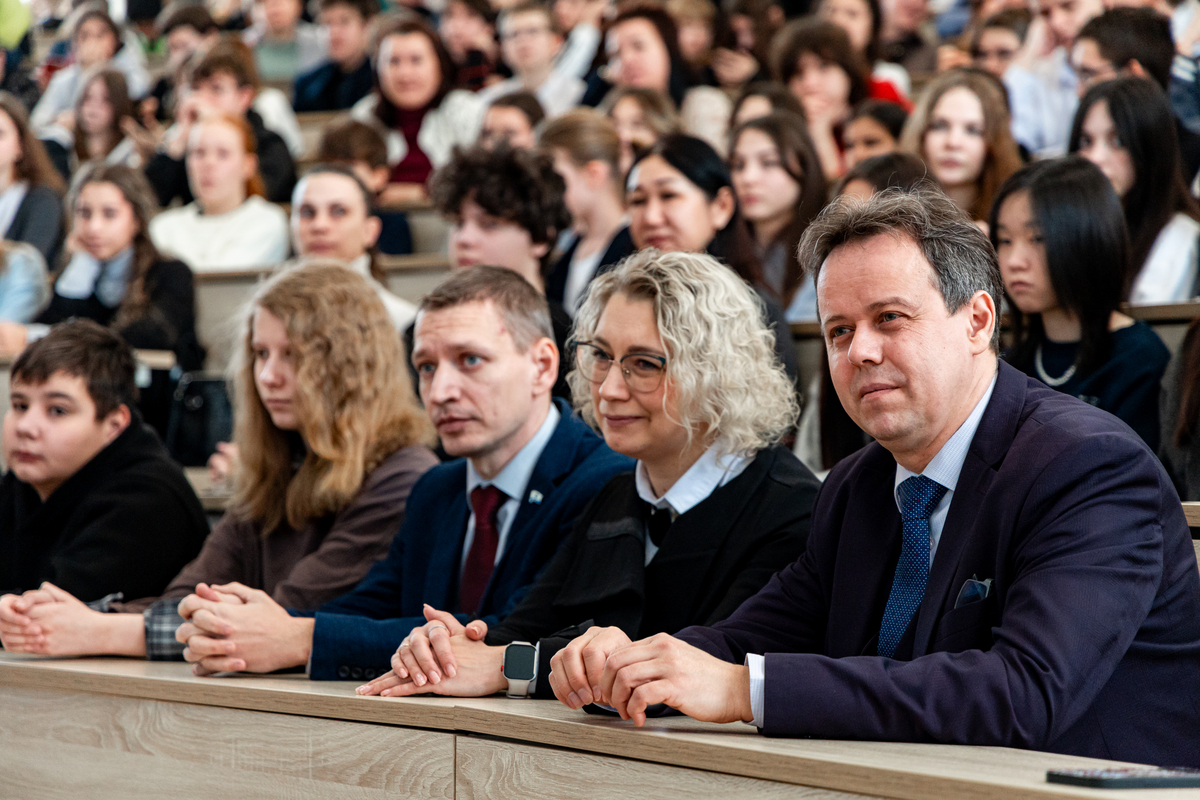 В III корпусе к собравшимся на фестиваль старшеклассникам обратился директор Института физики С.Б. Вениг. Сергей Борисович рассказал об исторической значимости Большой физической аудитории – в ней на разных этапах истории присутствовало 6 Нобелевских лауреатов.