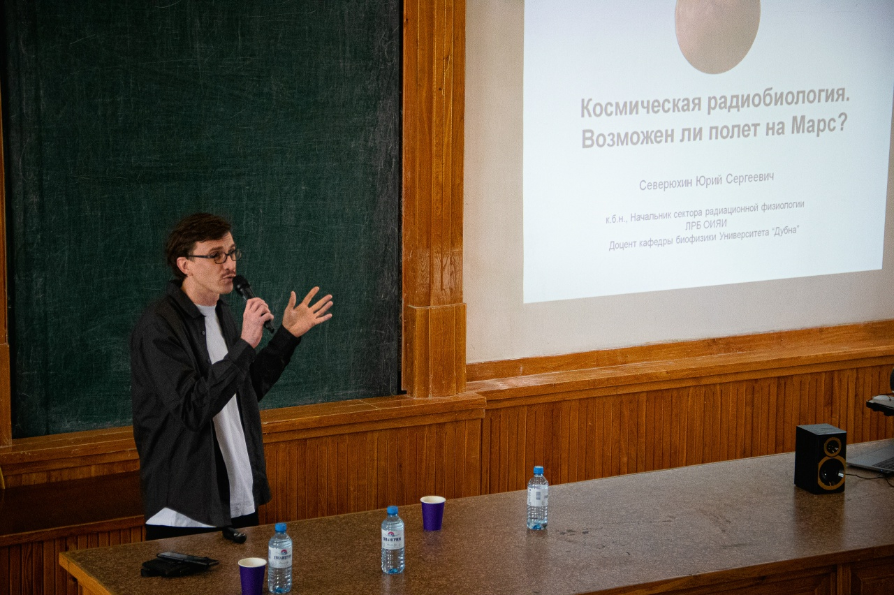 Начальник сектора радиационной физиологии Объединённого института ядерных исследований (Дубна) Ю.С. Северюхин на лекции «Космическая радиобиология. Возможен ли полет на Марс?» объяснил, что такое космическая радиация и как она влияет на организм человека в полёте.