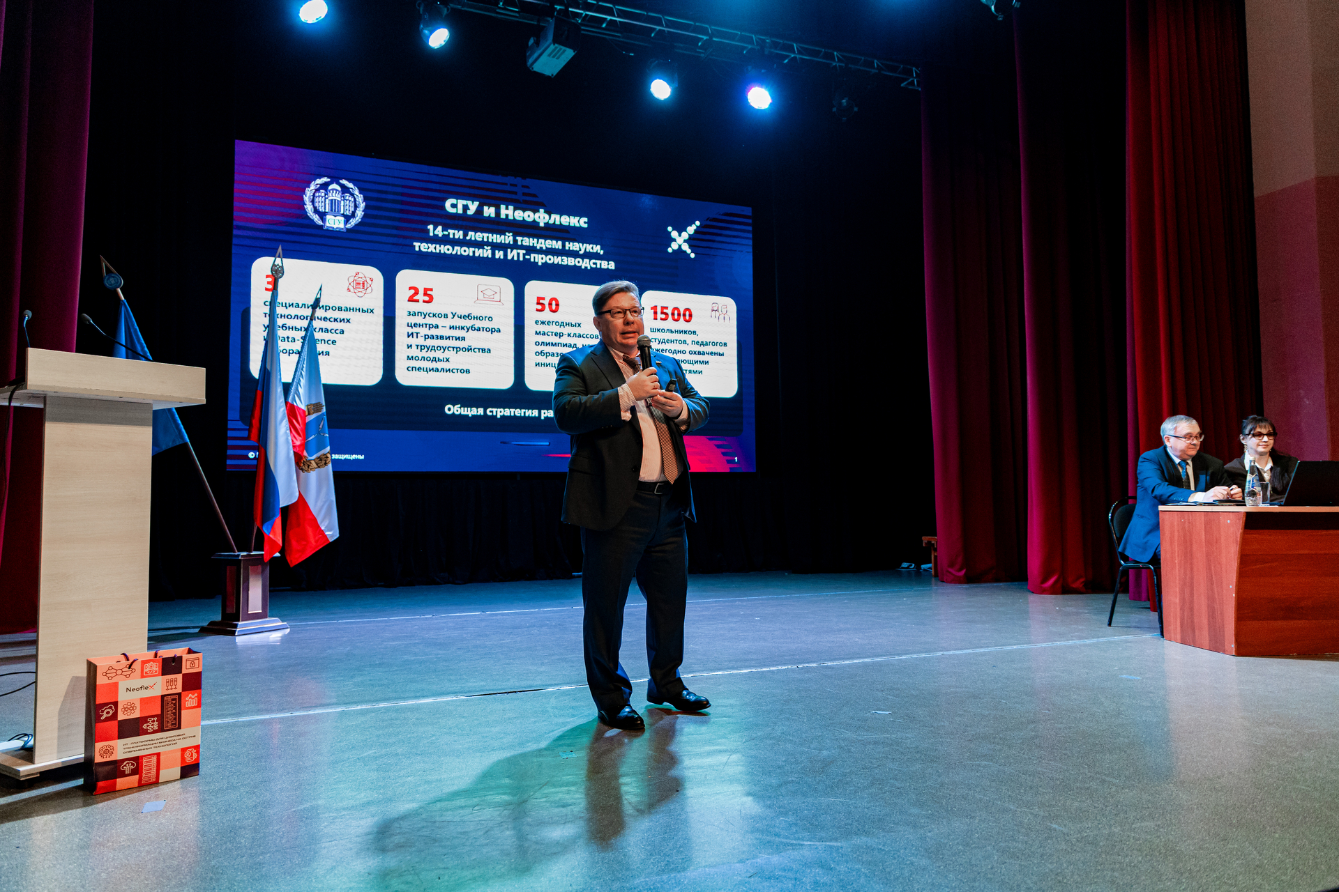 На базе университета развиваются проекты Неофлекса: 3 технологических учебных класса, Data-science лаборатория. Продолжает работу Учебный центр Неофлекс, его лучшие выпускники, среди которых есть и студенты СГУ, смогли успешно трудоустроиться в компанию. Р.Б. Родионов отметил, что более 50 процентов сотрудников саратовского филиала (а это более 150 человек) – выпускники СГУ.