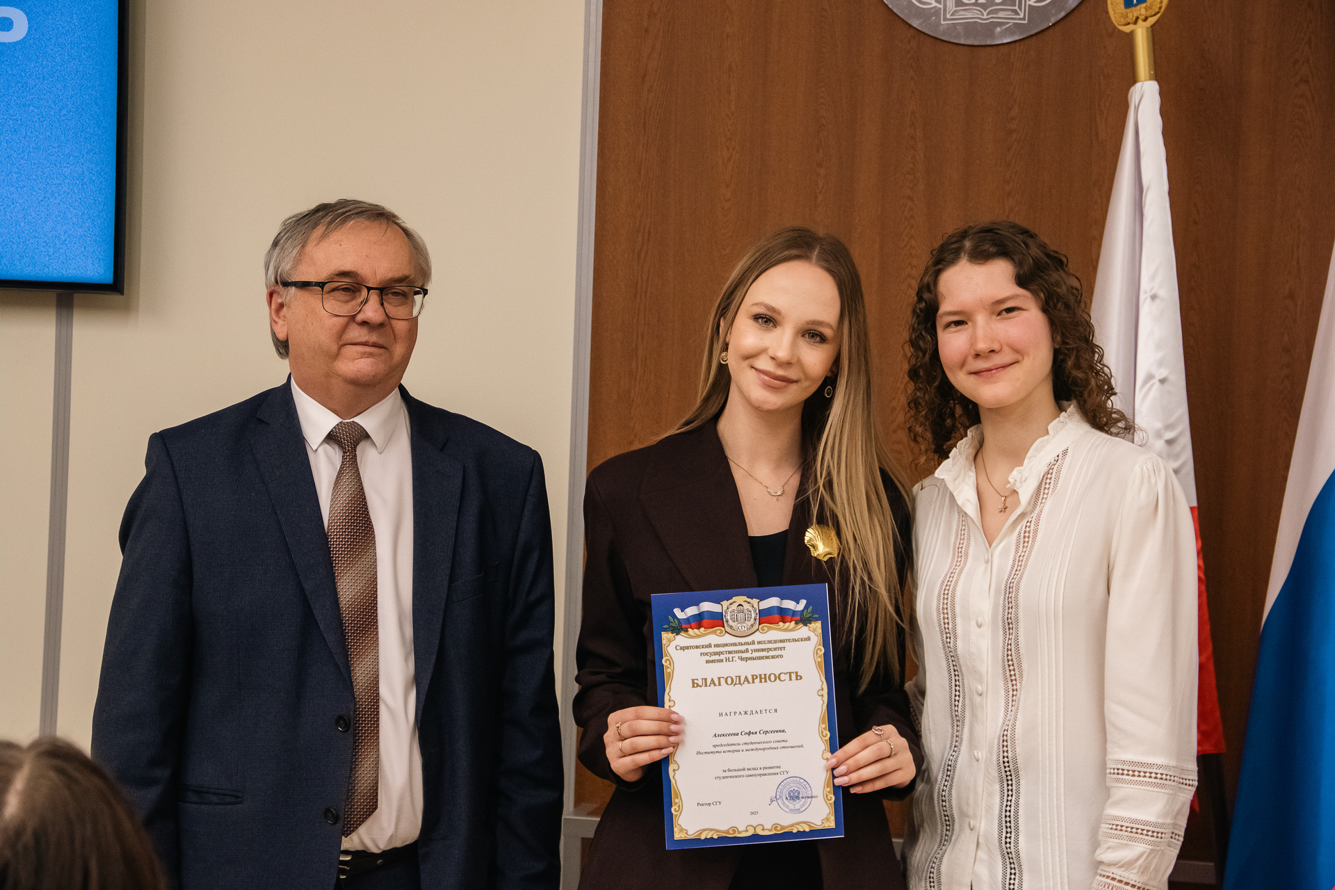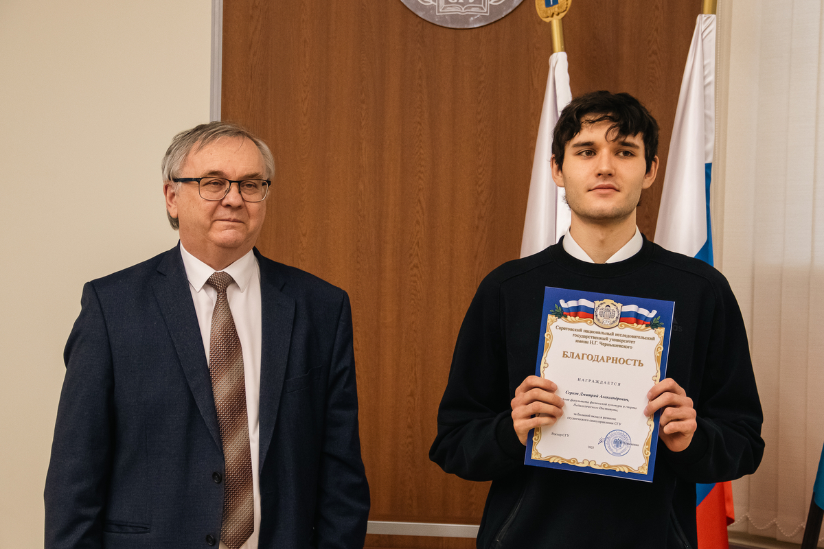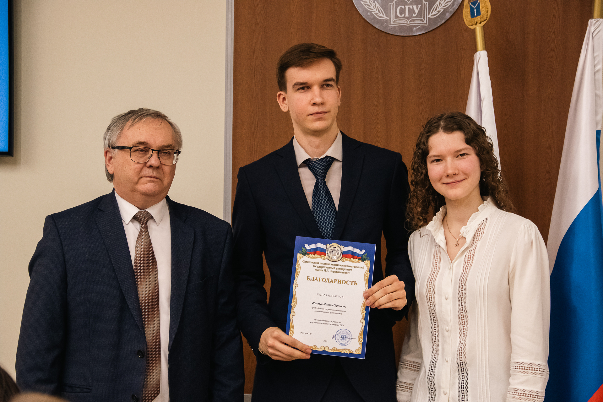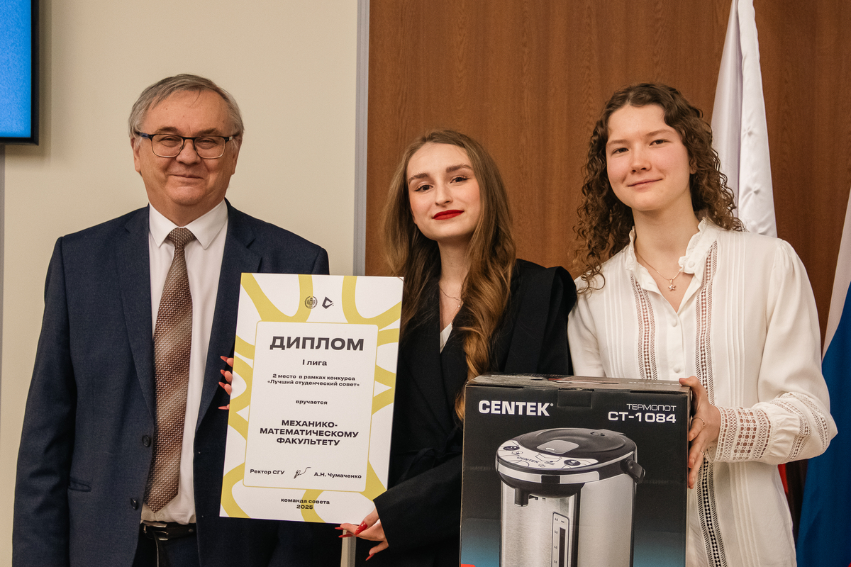 Торжественное награждение провели ректор А.Н. Чумаченко и председатель Совета студентов и аспирантов СГУ Кира Макаричева.