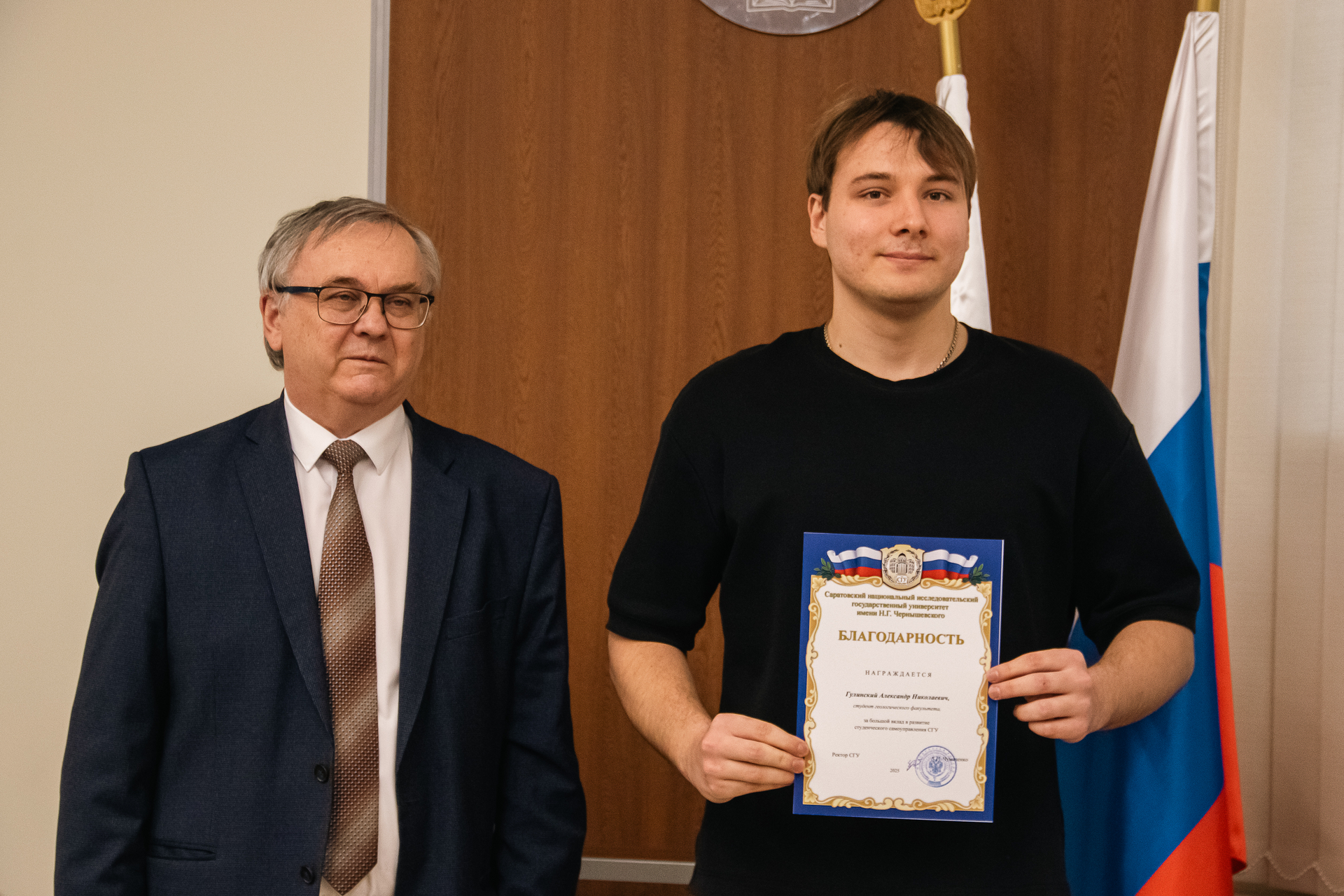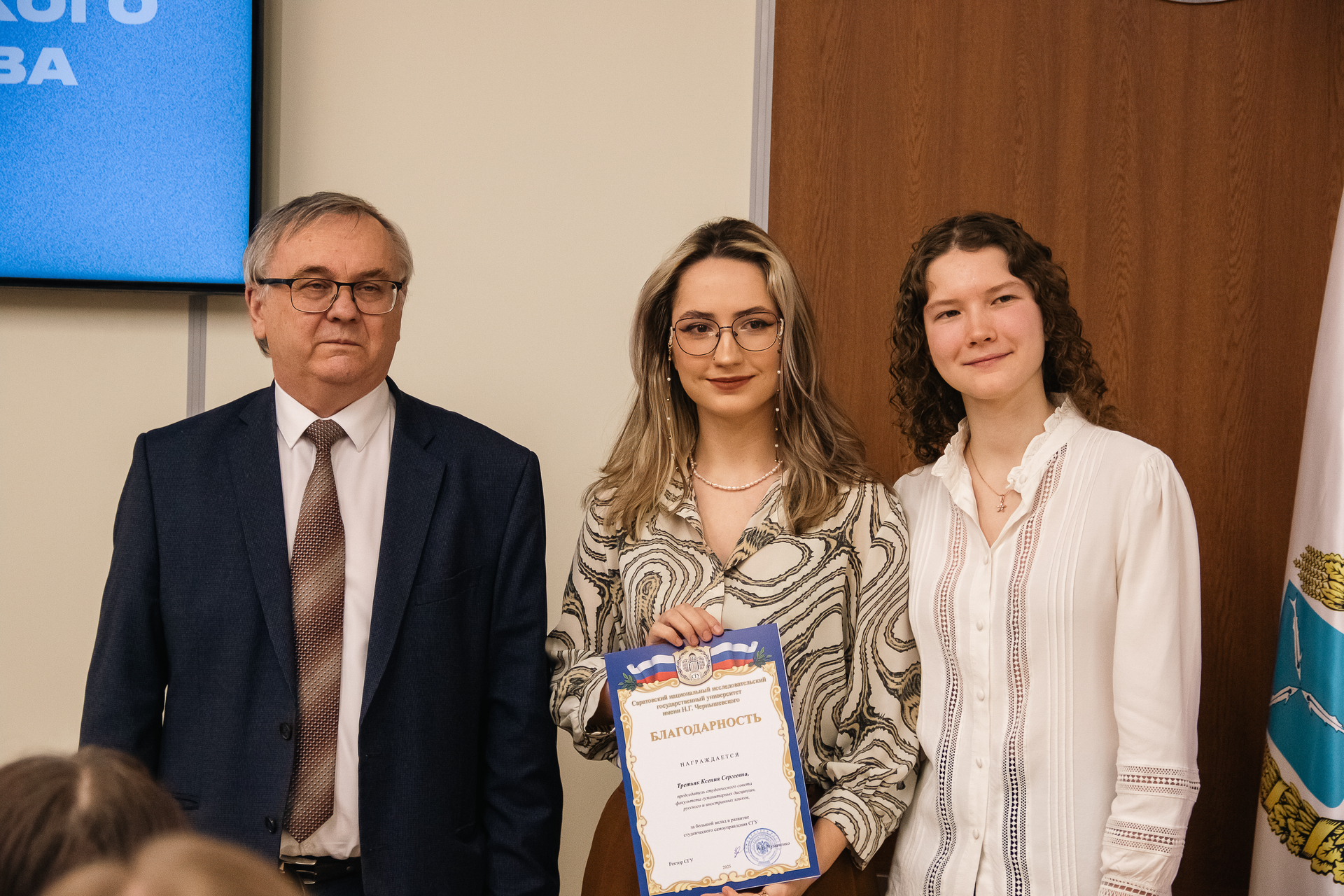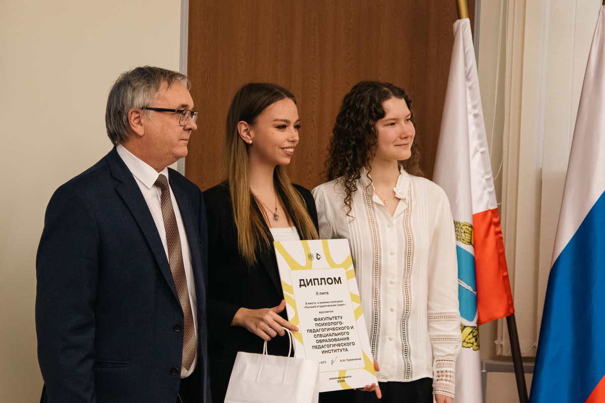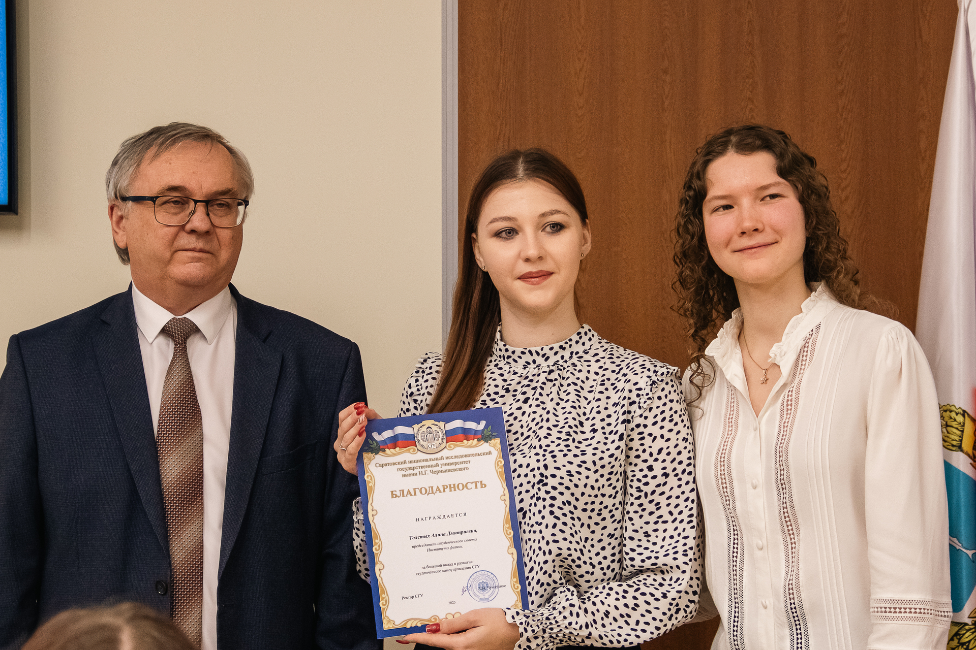Торжественное награждение провели ректор А.Н. Чумаченко и председатель Совета студентов и аспирантов СГУ Кира Макаричева.