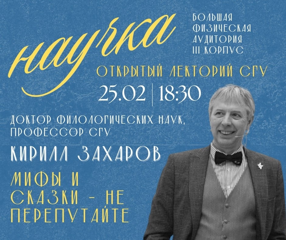 СГУ продолжает новый университетский просветительский спецпроект – открытый лекторий «Научка». Вторым лектором проекта станет профессор кафедры общего литературоведения и журналистики СГУ К.М. Захаров, а темой станут мифы и сказки.