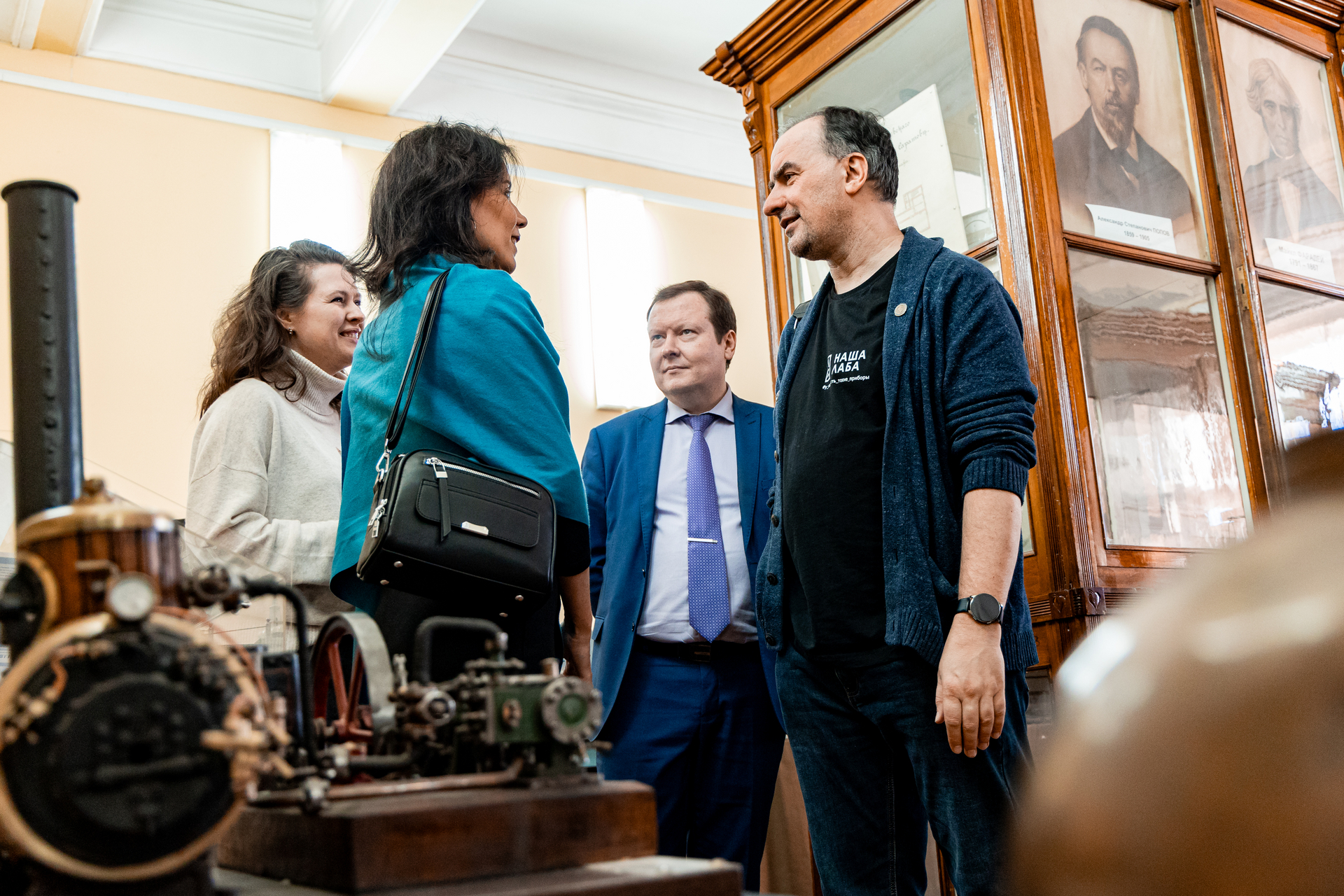 В завершение встречи для лектора провели экскурсию в учебную лабораторию Института физики – Музей физических приборов. Среди его экспонатов – фонограф Эдисона, катодные трубки Пулюя и Крукса, органные трубы, паровая машина, трансформатор Теслы, маятник Фуко и другое оборудование, которое сейчас используется в учебных курсах университета.